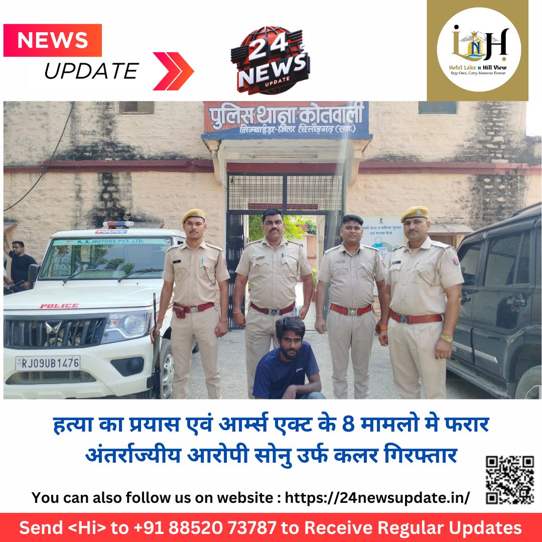 24 न्यूज अपडेट, निम्बाहेड़ा निम्बाहेडा 23 सितम्बर। कोतवाली निंबाहेड़ा थाना पुलिस की विशेष टीम ने हत्या का प्रयास एवं आर्म्स एक्ट के 8 मामलो मे फरार अंतर्राज्यीय आरोपी सोनु उर्फ कलर को गिरफ्तार किया है । आरोपी के विरूद्व दर्जन भर से अधिक हत्या का प्रयास, आर्म्स एक्ट, लडाई झगडा, डकेती, उद्यापन्न, एवं फिरोती मांगने के प्रकरणों में राजस्थान के 10 से अधिक थानो मे फरार चल रहा था।