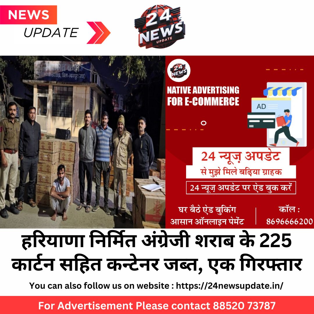 24 न्यूज अपडेट, उदयपुर। जिला पुलिस अधीक्षक, उदयपुर योगेश गोयल द्वारा अवैध शराब के विरुद्ध चलाये जा रहे अभियान के तहत अंजना सुखवाल अतिरिक्त पुलिस अधीक्षक, खेरवाडा एवं राजीव राहर वृताधिकारी वृत्त ऋषभदेव के सुपरविजन में बलपत सिंह राठौड थानाधिकारी, खेरवाडा मय टीम द्वारा मुखबीर की सूचना पर नेशनल हाईवे 48 पर एक कन्टेनर जिसके नम्बर एच.आर. 67 डी 8831 को रूकवाया गया व कन्टेनर चालक से नाम पता पूछा तो उसने अपना नाम नजरूदीन उर्फ वकील पिता हारून खान निवासी मैन्दापुर पुलिस थाना फिरोजपुर जिला नूह हरियाणा बताया। चालक नजरूदीन से कण्टेनर में क्या माल भरा है बाबत पुछा गया तो कहने लगा की कण्टेनर में प्लास्टिक के दानों के कट्टे भरे हैं। कन्टेनर संदिग्ध होने पर टीम द्वारा बैंक गया तो प्लास्टिक के सफेद रंग के कटटे जिनमें प्लास्टिक के दाने भरे होकर उक्त प्लास्टिक के कट्टो की आड़ में अंग्रेजी शराब के कार्टून भरे हुये थे। जिनकी गिनती करने पर हरियाणा निर्मित अवैध अंग्रेजी शराब के कुल 225 कार्टून पाये गये। चालक नजरूदीन द्वारा बिना अनुज्ञापत्र एवं लाईसेंस के अवैध शराब अपने कब्जे में रख परिवहन करना धारा 19/54 आबकारी अधिनियम का अपराध पाया जाने से अभियुक्त को गिरफतार किया गया व उक्त अवैध अंग्रेजी शराब एवं कन्टेनर एचआर 67 डी 8831 को भी जब्त कर प्रकरण दर्ज किया जाकर अग्रिम अनुसंधान जारी है।