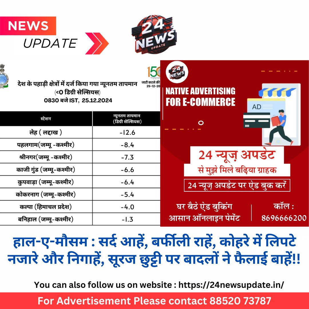 24 न्यूज़ अपडेट नेशनल डेस्क। आज मौसम गजब का है। पूरा उत्तर भारत सर्दी के आगोश में जकडा हुआ है। कहीं पर बर्फबारी का आनंद लिया जा रहा है तो कहीं रास्तों पर बर्फ जमने से लोग फंस गए हैं। कही बारिशों के दौर चल रहे हैं तो कहीं बारिशों का इंतजार किया जा रहा है। उस पर कोहरा तो गजब ढा रहा है। कोहरे की चादर में सूरज छुट्टी लेकर सो गया है तो बादलों ने अपनी बाहें फैला कर कई शहरों को सर्दी से सराबोर कर दिया है। ये मंजर वाकई शानदार हैं। नदियों व पहाड़ों, झीलों वाले पर्यटन स्थलो ंपर पर्यटकों के लिए ये लम्हें यादगार हैं तो खेतों में किसान को बारिश या मावठ का इंतजार है। मावठ का अमृत जहां फसलो ंके लिए जीवनदान का संदेश लाएगा तो जनजीवन इस सोच से ही सिकुड और ठिठुर रहा है कि बारिश होगी तो उसका क्या होगा। मौसम विभाग की मुस्तैदी से सबको पता है कि आज से अगले चार दिन तक यही मंजर रहने वाला है। मौसम का मिजाज ठंडा और बिगडा ही रहेगा। ऐसे में जाब्ता लेकर ही बार निकलना है व सर्दी को हराना है। वैसे सुबह से कई लोग ठंडी आहें भरते हुए अलाव जला कर बैठ गए हैं और उसके सहारे अपनी दिनचर्या को आगे बढ़ा रहे हैं तो बाकी लोग क्रिसमस के अवकाश का घरों में ही आनंद ले रहे हैं। जस्ट चिल वाले इस समां में जम्मू-कश्मीर, उत्तराखंड और हिमाचल प्रदेश में बर्फबारी का दौर चल रहा है। लाहौल और स्पीति का कुकुमसेरी सबसे ठंडा रहा। यहां रात का तापमान माइनस 6.9° से नीचे चला गया है। हिमाचल में बर्फीली राहों से तीन नेशनल हाईवे समेत 223 सड़कें काम कर नहीं रही हैं उन पर बर्फ की चादर जो जम गई है। शिमला में 145 सड़कें बंद बताई जा रही हैं तो कुल्लू में 25 और मंडी जिलों में 20 सड़कें बंद है। ऐसे में वहां पर आने वाले टूरिस्ट्स फंस गए हैं। सड़कों पर गाड़ियों की लंबी लाइनें लगी हैं। ये लोग यहां पर छुट्टियां मनाने आए हैं। राजस्थान और दिल्ली में बारिश के दौर चल रहे हैं। अगले तीन दिन तक राजस्थान में खास तौर पर उदयपुर व आस पास के संभागों में बारिश व ओलों का पूर्वानुमान है। 9 राज्यों मे घने कोहरे का भी अलर्ट है। आज राजस्थान के कई शहरों में विजिबिलिटी बहुत ही कम है। दिल्ली एयरपोर्ट ने एडवाइजरी जारी करते हुए कहा है कि कुछ फ्लाइट्स प्रभावित हो सकती है। उत्तरकाशीः मंगलवार को बर्फबारी के बाद गंगोत्री नेशनल हाईवे पर स्नोकटर मशीन लगाई गई है जो बर्फ को काट कर साफ कर ही है। श्रीनगरः डल झील जम गई है। पारा माइनस 6 तक रिकॉर्ड किया गया है। गुलमर्ग में माइनस 7.4°, काजीगुंड में माइनस 6.2° तापमान रहा। पंपोर का एक छोटा सा गांव कोनीबल माइनस 8.5° के साथ सबसे ठंडा रहा।