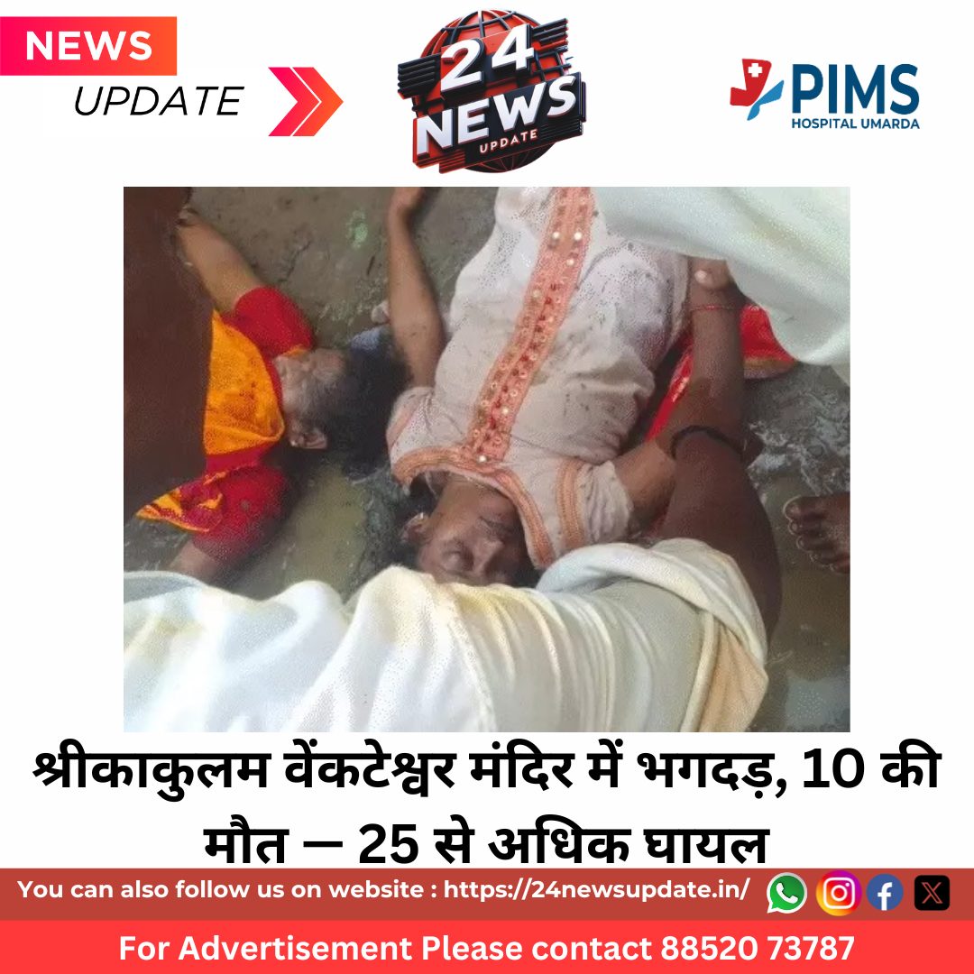 24 News Update श्रीकाकुलम (आंध्र प्रदेश)। एकादशी के अवसर पर शनिवार को श्रीकाकुलम जिले के काशीबुग्गा स्थित प्रसिद्ध वेंकटेश्वर मंदिर में भारी भीड़ के बीच भगदड़ मच गई। इस हादसे में 10 श्रद्धालुओं की मौत हो गई, जिनमें 8 महिलाएं और 2 बच्चे शामिल हैं, जबकि 25 से अधिक लोग घायल हुए हैं। हादसे के बाद मंदिर परिसर में अफरा-तफरी मच गई।