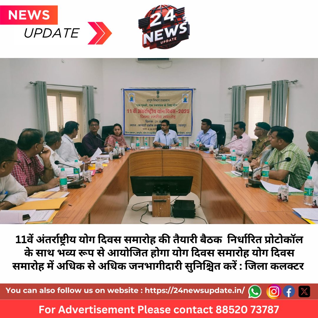 24 News Update उदयपुर। उदयपुर 11वें अंतर्राष्ट्रीय योग दिवस को भव्य रूप से आयोजित करने को लेकर मंगलवार को जिला कलक्टर नमित मेहता की अध्यक्षता में तैयारी बैठक कलक्ट्रेट सभागार में हुई। इसमें योग दिवस पर पंचायत से लेकर जिला स्तर पर निर्धारित प्रोटोकॉल के साथ भव्य एवं सफल आयोजन करने पर चर्चा की गई। साथ ही कार्यक्रम में अधिक से अधिक जनभागीदारी सुनिश्चित करने पर जोर दिया।