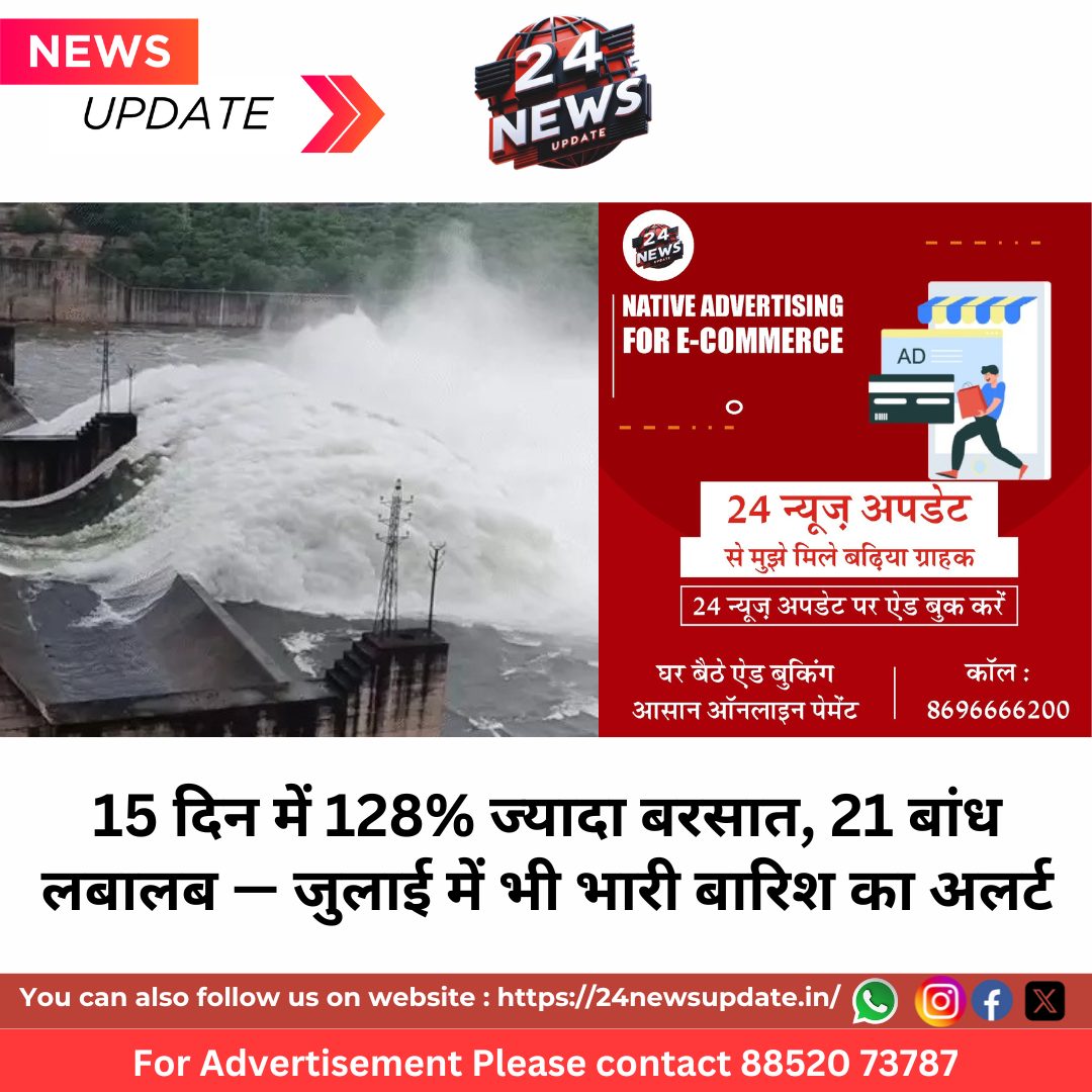 24 न्यूज अपडेट, स्टेट डेस्क। राजस्थान में इस बार मानसून ने सात दिन पहले दस्तक देकर मात्र 15 दिन में जून महीने की औसत से 128 फीसदी अधिक वर्षा दर्ज कर इतिहास रच दिया है। पूरे राज्य में भारी बारिश के चलते अब तक 21 बांध लबालब हो चुके हैं, जबकि 95 सूखे बांधों में भी पानी की आवक हुई है। मौसम विभाग ने अगले 15 दिनों में कोटा, उदयपुर, अजमेर, जयपुर और भरतपुर संभागों में भारी से अति भारी बारिश का अलर्ट जारी किया है।