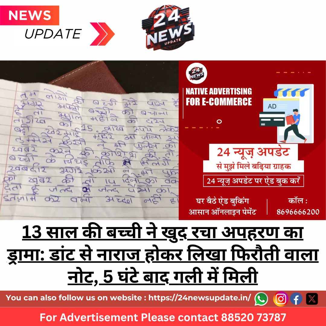 24 News Update जबलपुर। मां की डांट से नाराज एक 13 साल की सातवीं कक्षा की छात्रा ने खुद के अपहरण की झूठी कहानी रच डाली। बच्ची ने घर पर एक एक पन्ने का फिरौती वाला धमकी भरा नोट छोड़ दिया और गायब हो गई। नोट में 15 लाख रुपये की मांग करते हुए लिखा था कि यदि पुलिस को खबर दी तो “बच्ची के चिथड़े तोहफे में मिलेंगे।”