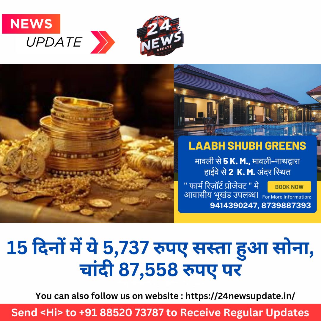 24 न्यूज अपडेट. जयपुर। सोने-चांदी की कीमतों में दीपावली के बाद आज सबसे बड़ी गिरावट देखने को मिली रही है। 10 ग्राम 24 कैरेट सोने के भाव 1,316 रुपए गिरकर 73,944 रुपए पर आ गए। दाम 75,260 रुपए प्रति दस ग्राम तक पहुंच गया। चांदी में 2,189 रुपए की गिरावट रही व 87,558 रुपए प्रति किलो हो गई। जबकि धन तेरस पर लोगों ने 1 लाख रूपए किलो तक भाव पहुंच गया था। सोने ने भी 79 हजार 681 रुपए का ऑल टाइम हाई बना कर जनता को त्योहारी खरीद के नाम पर खूब लटा था। अगर 15 दिन के साने के भावों का विश्लेषण करें तो हम पाते हैं कि 24 कैरेट सोना 5,737 रुपए प्रति 10 ग्राम की गिरावट आई है। चांदी 87 हजार 558 रुपए प्रति किलो पर पहुंच गई।