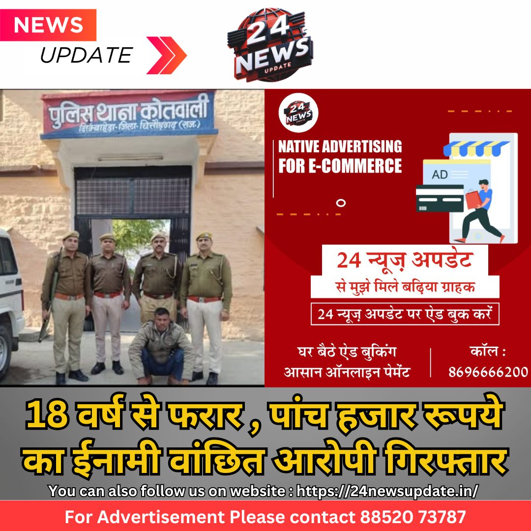 24 न्यूज़ अपडेट चित्तौड़गढ़। कोतवाली निम्बाहेडा पुलिस थाना की विशेष टीम ने 18 वर्ष से फरार पांच हजार रुपए के इनामी एनडीपीएस प्रकरण में वांछित आरोपी मोतीसिंह को गिरफ्तार किया है। पुलिस अधीक्षक सुधीर जोशी ने बताया कि नशाखोरी पर प्रभावी नियंत्रण एवं उन्मुलन के लिये अवैध मादक पदार्थो की धरपकड एवं मादक पदार्थो के प्रकरणो मे वांछित अपराधियो, स्थाई वारण्टीयो, उदघोषित एवं ईनामी अपराधियो की धरपकड़ हेतु एक विशेष अभियान जिले में चलाया जा रहा है। जिसमें समस्त थानाधिकारियों व विशेष टीम को अधिक से अधिक संख्या मे अपराधियो की धरपकड के निर्देश दिए गए इसी क्रम में एएसपी सरीता सिंह व डीएसपी निम्बाहेड़ा बद्री लाल राव के निर्देशन में थानाधिकारी कोतवाली निम्बाहेडा रामसुमेर पु.नि. के नेतृत्व में एएसआई सूरज कुमार, साइबर सेल के हैड कानि. राजकुमार, एमओबी शाखा के हैडकानि राकेश, कानि. देवेंद्र , विरेन्द्र, विजय व राकेश की एक टीम गठित की गई। उक्त टीम द्वारा आसूचना संकलन की गई एवम् मौतबिरान से लगातार सम्पर्क किया गया दिनाक 21 जनवरी 2025 को जिला विशेष टीम के एएसआई सूरज कुमार को जरिये मुखबीर सूचना मिली की थाना एनडीपीएस के मामले मे वांछित अभियूक्त मोती सिंह अपने घर पर आया हुआ है तथा अभी नीमच चौराया पर देखा गया जो संगराणा घाटी की तरफ जा रहा है। सुचना मुखबिर विश्वसनीय होने से एएसआई सूरज कुमार मय टीम के अविलम्ब रवाना हो नीमच संगराणा घाटी पहुचे तलाश की तो मुखबिर के बताये हुलिये का व्यक्ति रोड पर चलता हुआ दिखाई दिया जिसको पास जाकर उसे रूकवाया तो उक्त व्यक्ति जाप्ता पुलिस को बावर्दी देखकर भागने का प्रयास करने लगा जिसको एएसआई सूरज कुमार मय टीम ने घेरा देकर पकडा व नाम पता पुछा तो उसने अपना नाम मोती सिंह पिता भैरूसिंह जाति राजपुत उम्र 55 साल निवासी सेमली मेवाड़ थाना बघाना जिला नीमच मध्यप्रदेश होना बताया जो कि कोतवाली निंबाहेड़ा थाने के वर्ष 2006 के एनडीपीएस के प्रकरण में वांछित हो पुलिस अधीक्षक कार्यालय से 5000/-रूपये का ईनाम घोषित होने से अभियुक्त मोती सिंह को गिरफतार किया गया। Share this: Share on X (Opens in new window) X Share on Facebook (Opens in new window) Facebook More Email a link to a friend (Opens in new window) Email Share on WhatsApp (Opens in new window) WhatsApp Like this:Like Loading... Related Discover more from 24 News Update Subscribe to get the latest posts sent to your email. Type your email… Subscribe Post navigation 23 किलो से अधिक अवैध डोडाचूरा तथा स्कॉर्पियो गाड़ी जब्त, दो तस्कर गिरफतार जिला कलक्टर की भाटोली गुजरान में हुई रात्रि चौपाल ग्रामीणों के लिए रही राहत भरी, बिजली बिल अधिक आने पर एइएन को भेजा मीटर चेक करने, सखाजी और नोजीबाई की हाथों हाथ शुरू हुई वृद्धावस्था पेंशन