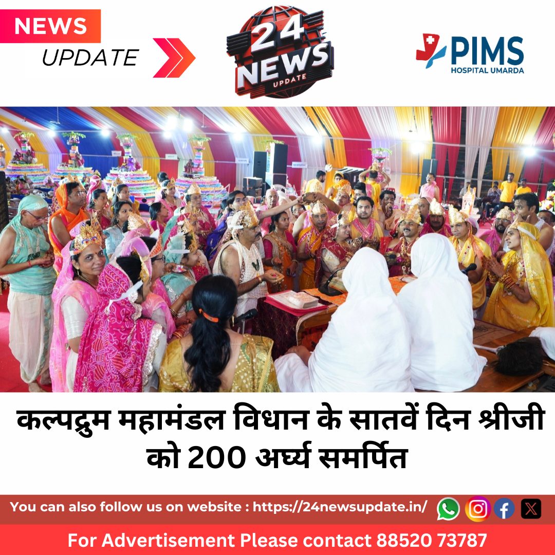 24 News Update खेरवाड़ा, आर्यिका सुप्रज्ञ मति माताजी संसंघ के सानिध्य में चल रहे 11 दिवसीय विधान के सातवें दिन संगीतकार संजय जैन एंड पार्टी की मधुर ध्वनि के साथ कल्पद्रुम महामंडल विधान में कुल 200 अर्घ्य समर्पित किए गए। चातुर्मास कमेटी के अध्यक्ष नरेन्द्र पंचोली ने बताया कि प्रातः बैंड बाजे के साथ आर्यिका संघ को निमंत्रण के साथ नेमीनाथ जिनालय से कार्य क्रम स्थल लाया गया जहां पर श्रीजी की दूध से शांतिधारा एवं अभिषेक किया गया। बोली दातार एवं सौभाग्यशाली श्रावक श्राविकाओं द्वाराआर्यिका सुप्रज्ञ मति माताजी का पाद प्रक्षालन किया गया। प्रतिष्ठाचार्य एवं विधानाचार्य अरविंद जैन के निर्देशन में समवशरण के निमित्त आर्यिकाओं एवं भगवान के पंच कल्याणक की साज आवाज के साथ पूजा की गई ।