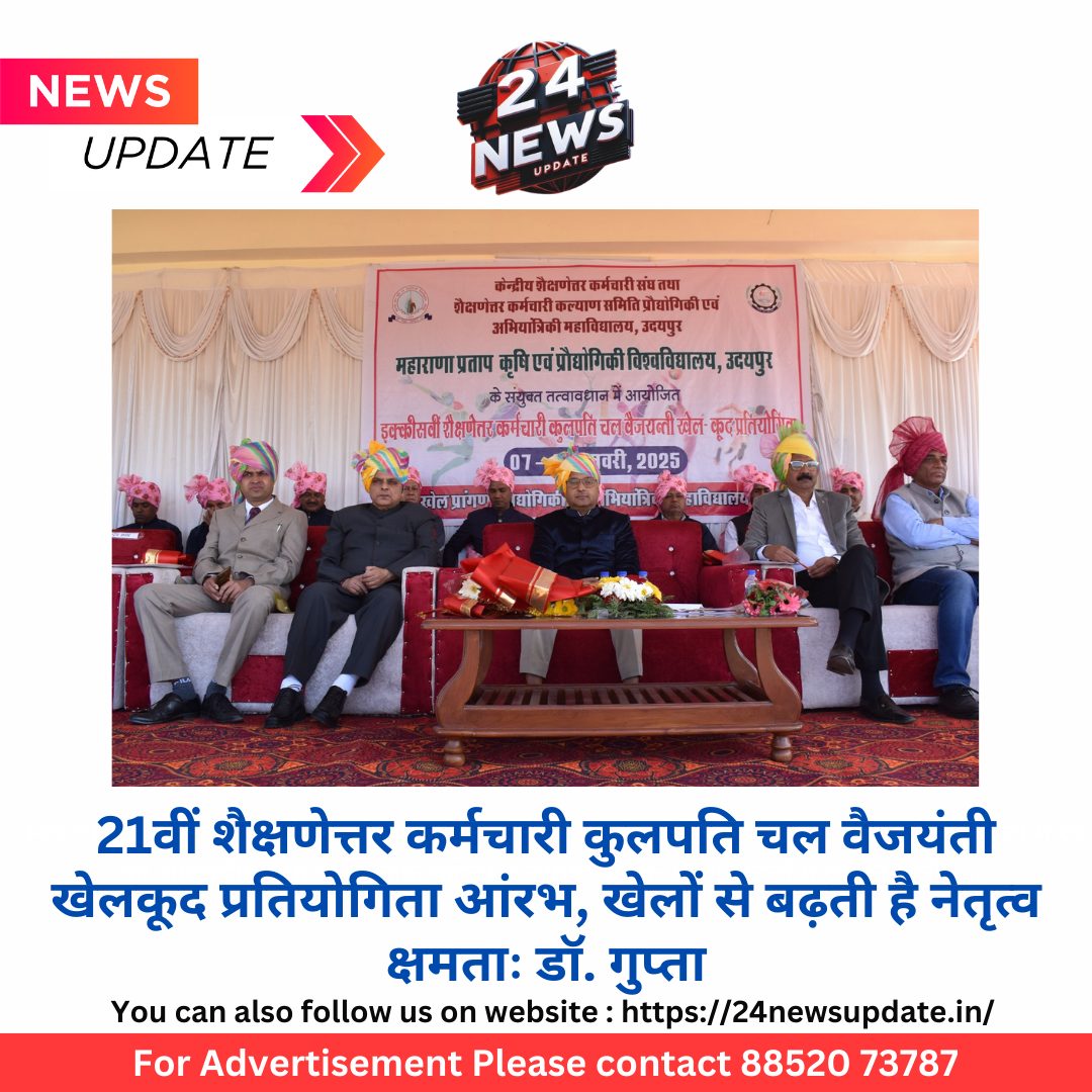 24 न्यूज अपडेट. उदयपुर। इक्कीसवीं शैक्षणेत्तर कर्मचारी कुलपति चल वैजयंती खेल-कूद प्रतियोगिता मंगलवार से यहां प्रौद्योगिकी एवं अभियांत्रिकी महाविद्यालय उदयपुर के खेल प्रागंण पर आंरभ हुई। प्रतियोगिता में तीन सौ से ज्यादा खिलाड़ी भाग ले रहे है। महाराणा प्रताप कृषि एवं प्रौद्योगिकी विश्वविद्यालय अंतर्गत केन्द्रीय शैक्षणेत्तर कर्मचारी संघ एवं शैक्षणेत्तर कर्मचारी कल्याण समिति प्रौद्योगिकी एवं अभियांत्रिकी महाविद्यालय उदयपुर के संयुक्त तत्वावधान में अयोजित चल वैजयंती खेल-कूद प्रतियोगिता में प्रशासनिक कार्यालय टीम, सीटीएई, कृषि महाविद्यालय, प्रसार शिक्षा निदेशालय, भूसंपत्ति अधिकारी कार्यालय की टीमों के अलावा डेयरी एवं खाद्य प्रौद्योगिकी महाविद्यालय, सामुदायिक एवं व्यवहारिक विज्ञान महाविद्यालय और सीसीपीसी की संयुक्त टीमें भाग ले रही है। इसके अलावा बांसवाड़ा, डूंगरपुर, प्रतापगढ़, आरजीया भीलवाड़ा व वल्लभनगर की टीमें भी भाग ले रही है।प्रतियोगिता का उद्घाटन अधिष्ठाता डेयरी एवं खाद्य प्रौद्योगिकी महाविद्यालय एवं सदस्य प्रंबध मंडल डॉ. लोकेश गुप्ता ने किया। इस मौके पर डॉ. गुप्ता ने कहा कि खेल खेलने से टीमवर्क नेतृत्व क्षमता, जवाब देही, धर्म और आत्मविश्वास जैसे जीवन कौशल सीखने में मदद मिलती है। उन्होंने कहा कि खेल चाहे कोई भी हो, वह मानव के शारीरिक और मानसिक विकास में अहम भूमिका निभाता है। खेल जीवन को सकारात्मक तरीके से प्रभावित करते है और हमे जीवन में आगे बढ़ने की प्रेरणा देते है।स्वागत उद्बोधन रजनीकांत शर्मा अध्यक्ष केन्द्रीय शैक्षणेत्तर कर्मचारी संघ ने जबकि अध्यक्षीय उद्बोधन प्रो. अनुपम भट्नागर अधिष्ठाता सीटीएई ने दिया, उन्होंने कहा कि खेल को खेल की भावनाओं के साथ खेलें यह खेल प्रतियोगिता लोगों में भाईचारा एवं नया रिश्ता विकसित करेगी। उद्घाटन मेच वालीबॉल प्रसार शिक्षा निदेशालय और सीडीएफएडटी, सी.सी.ए.एस. और सीसीपीसी की संयुक्त टीम के मध्य हुआ। इसके अलावा बॉस्केटबॉल, फुटबॉल, कबड्डी व इनडोर गेमों के मुकाबले हुए।आरंभ में मुख्य अतिथि डॉ. गुप्ता द्वारा ध्वजारोहण व परेड की सलामी ली गई व प्रतियोगिता के विधिवत उद्घाटन की घोषणा की। अधिष्ठाता सीटाएई प्रो. अनुपम भटनागर ने मुख्य अतिथि का स्वागत किया। शैक्षणेत्तर कर्मचारी कल्याण समिति के अध्यक्ष गीतेश जैन ने प्रतियोगिता का विवरण प्रस्तुत किया। नरेन्द्र कुमार मोड़ केन्द्रीय महामंत्री शैक्षणेत्तर कर्मचारी संघ ने धन्यवाद ज्ञापित किया। कार्यक्रम में विशिष्ठ अतिथि सिधांशु सिंह, कुल सचिव, विनय भाटी, वित्त नियंत्रक, डॉ. आर.एल. सोनी, निदेशक प्रसार शिक्षा, डॉ. एल.एल पंवार, अधिष्ठाता, कृषि महाविद्यालय भीलवाड़ा,