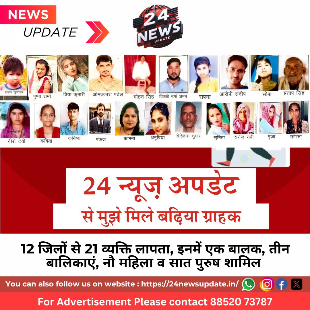 24 News Update. जयपुर, 23 अप्रेल। राजस्थान पुलिस प्रदेश से गुमशुदा व्यक्तियों की निरन्तर तलाश कर रही है। प्रदेश के सवाई माधोपुर जिले से एक बालक, दौसा जिले से दो महिला एवं एक पुरुष, भरतपुर जिले से दो पुरूष, कोटपुतली बहरोड जिले से एक बालिका एवं एक पुरूष, अलवर जिले से एक बालिका, चुरू जिले से एक पुरूष, बाडमेर जिले से एक महिला, सिरोही जिले से एक बालिका, जयपुर ग्रामीण जिले से एक बालक, झुन्झुनु जिले से एक पुरूष तथा हनुमानगढ जिले से एक पुरूष तथा छ महिलाएं कुल 21 व्यक्ति अलग-अलग तारीख से लापता है। किसी को इनके बारे में कोई भी जानकारी हो तो कृपया तुरन्त जिला कंट्रोल रूम एवं संबंधित थाने पर सूचित करें।