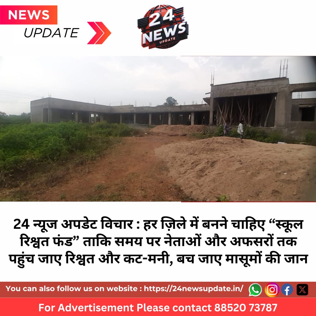 24 न्यूज अपडेट, उदयपुर। अब किसी जिले को स्कूल की बिल्डिंग चाहिए,, मरम्मत आदि करनी है, छतें जर्जर होने वाली है तो काम शुरू करने से पहले ही एक “स्कूल रिश्वत फंड” तैयार किया जाना चाहिए। बाकायदा जिले स्तर पर एक स्थायी कोष हो जहां जनता से ही चंदा बेशर्मी से वसूला जाए और निर्माण से पहले ही 10-10 प्रतिशत के भूखे, नंगे व दीमक बन चुके अफसरों, नेताओं और विभागीय ठेकेदारों तक उनका हिस्सा तत्काल पहुँचा दिया जाए। फिर जब यह अनिवार्य कर्तव्य पूरा हो जाए तो उसके बाद बचे हुए सरकारी पैसे से स्कूल की बिल्डिंग बनाई जाए। कम से कम इतनी मजबूत बने कि किसी मासूम की छज्जा गिरने से जान तो नहीं जाए।