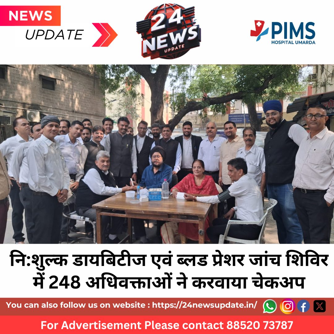24 news Update उदयपुर. उदयपुर बार एसोसिएशन एवं सिख समाज सेवा समिति के संयुक्त तत्वावधान में आज कोर्ट परिसर, उदयपुर में नि:शुल्क डायबिटीज एवं ब्लड प्रेशर जांच शिविर का आयोजन किया गया। यह शिविर प्रातः 10:00 बजे से दोपहर 1:00 बजे तक चला, जिसमें कुल 248 अधिवक्ताओं ने अपनी नि:शुल्क जांच करवाई।