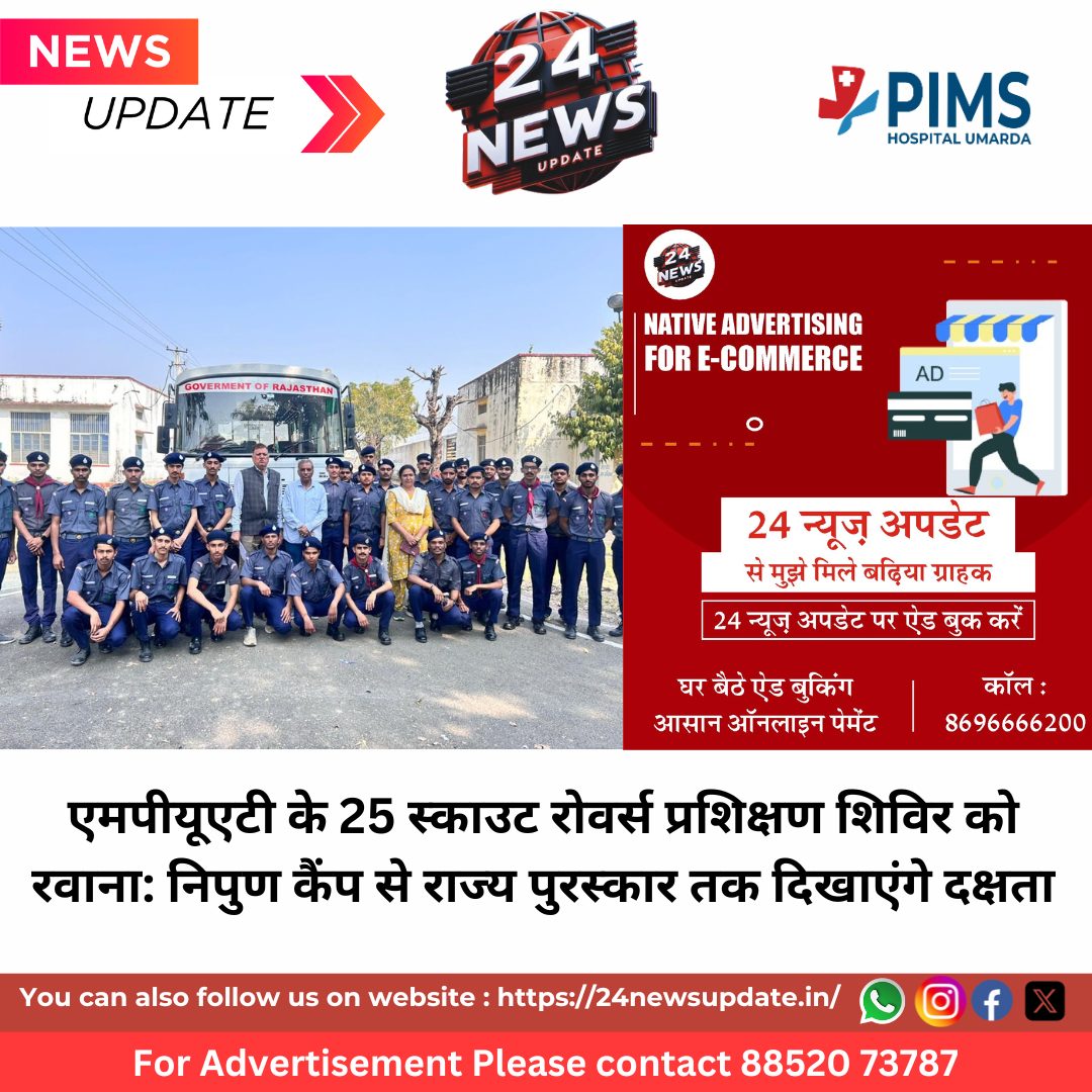 24 News Update उदयपुर, 21 फरवरी 2026। महाराणा प्रताप कृषि एवं प्रौद्योगिकी विश्वविद्यालय (एमपीयूएटी) की स्काउट इकाई के रोवर्स को शनिवार को प्रशिक्षण शिविर के लिए औपचारिक रूप से रवाना किया गया। राजस्थान कृषि महाविद्यालय के अधिष्ठाता डॉ. मनोज कुमार महला ने हरी झंडी दिखाकर दल को उदय निवास स्काउट प्रशिक्षण केन्द्र के लिए प्रस्थान कराया।