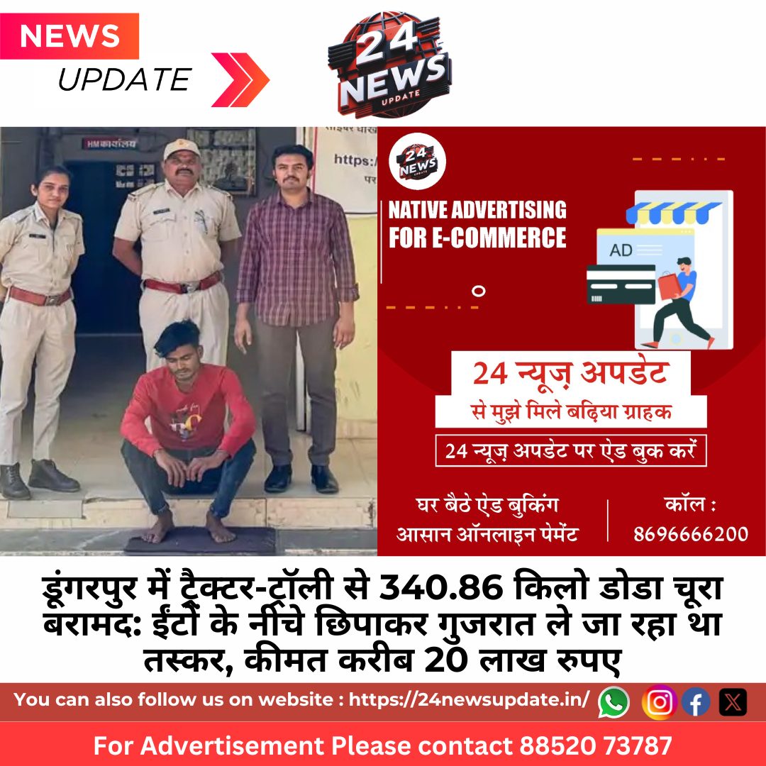 24 न्यूज अपडेट, डूंगरपुर। जिले की बिछीवाड़ा थाना पुलिस ने बड़ी कार्रवाई करते हुए नेशनल हाईवे 48 पर एक ट्रैक्टर-ट्रॉली से 340.86 किलो डोडा चूरा बरामद किया है। मादक पदार्थ की यह भारी खेप ईंटों के नीचे छिपाकर गुजरात ले जाई जा रही थी। पुलिस ने ट्रैक्टर चालक कमल सिंह को मौके से गिरफ्तार कर लिया है। जब्त डोडा चूरा की अनुमानित कीमत 20 लाख रुपए बताई जा रही है।