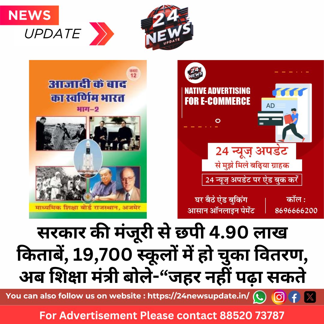 बहरहाल, राजस्थान बोर्ड की 12वीं की एक किताब पर विवाद हो गया है। माध्यमिक शिक्षा बोर्ड की ’आजादी के बाद का स्वर्णिम पुस्तक में पूर्व प्रधानमंत्री नेहरू, इंदिरा गांधी, राजीव गांधी और मनमोहन सिंह जैसे नेताओं के योगदान का विस्तृत वर्णन है, लेकिन वर्तमान प्रधानमंत्री नरेंद्र मोदी के योगदान को अपेक्षाकृत कम तवज्जो दिए जाने को लेकर सरकार ने नाराजगी जाहिर की है। इसके चलते न केवल इन किताबों को विद्यार्थियों को पढ़ाने पर रोक लगा दी गई है। बोर्ड में पदस्थ सीनियर असिस्टेंट डायरेक्टर दिनेश कुमार ओझा को एपीओ (अपेक्षित प्रतीक्षा आदेश) कर दिया गया है। मुख्यालय बीकानेर स्थित शिक्षा निदेशालय में कर दिया गया है। इसे बोर्ड सचिव कैलाश चंद्र शर्मा ने प्रशासनिक निर्णय नाम दिया हैं यह पुस्तक पिछले साल भी पढ़ाई गई थी। इस साल पुराने सिलेबस के तहत किताबें सरकारी परमिशन से ही छापी गई। यही नहीं राजस्थान राज्य पाठ्यपुस्तक मंडल के बैनर तले नए सत्र के लिए 4.90 लाख किताबें और छापी गई जिनमें से 80 प्रतिशत से अधिक किताबों का वितरण राज्य के 19,700 स्कूलों में हो चुका है। अब सरकार कह रही है कि यह किताब विद्यार्थियों को नहीं पढ़ाई जाएगी। शिक्षामंत्री मदन दिलावर ने प्रतिक्रिया देते हुए कहा, “चाहे लाखों की किताबें बर्बाद हो जाएं, लेकिन हम बच्चों को झूठा या पक्षपातपूर्ण इतिहास नहीं पढ़ा सकते। गलत जानकारी ‘जहर’ के समान है और हम वह नहीं बांट सकते।” कांग्रेस ने भाजपा सरकार की मंशा पर सवाल उठाए हैं। प्रदेशाध्यक्ष और गोविंदसिंह डोटासरा ने कहा, “क्या सरकार बच्चों से भारत का असली इतिहास छुपाना चाहती है? सरकार शिक्षा को विचारधारा की प्रयोगशाला बना रही है।”