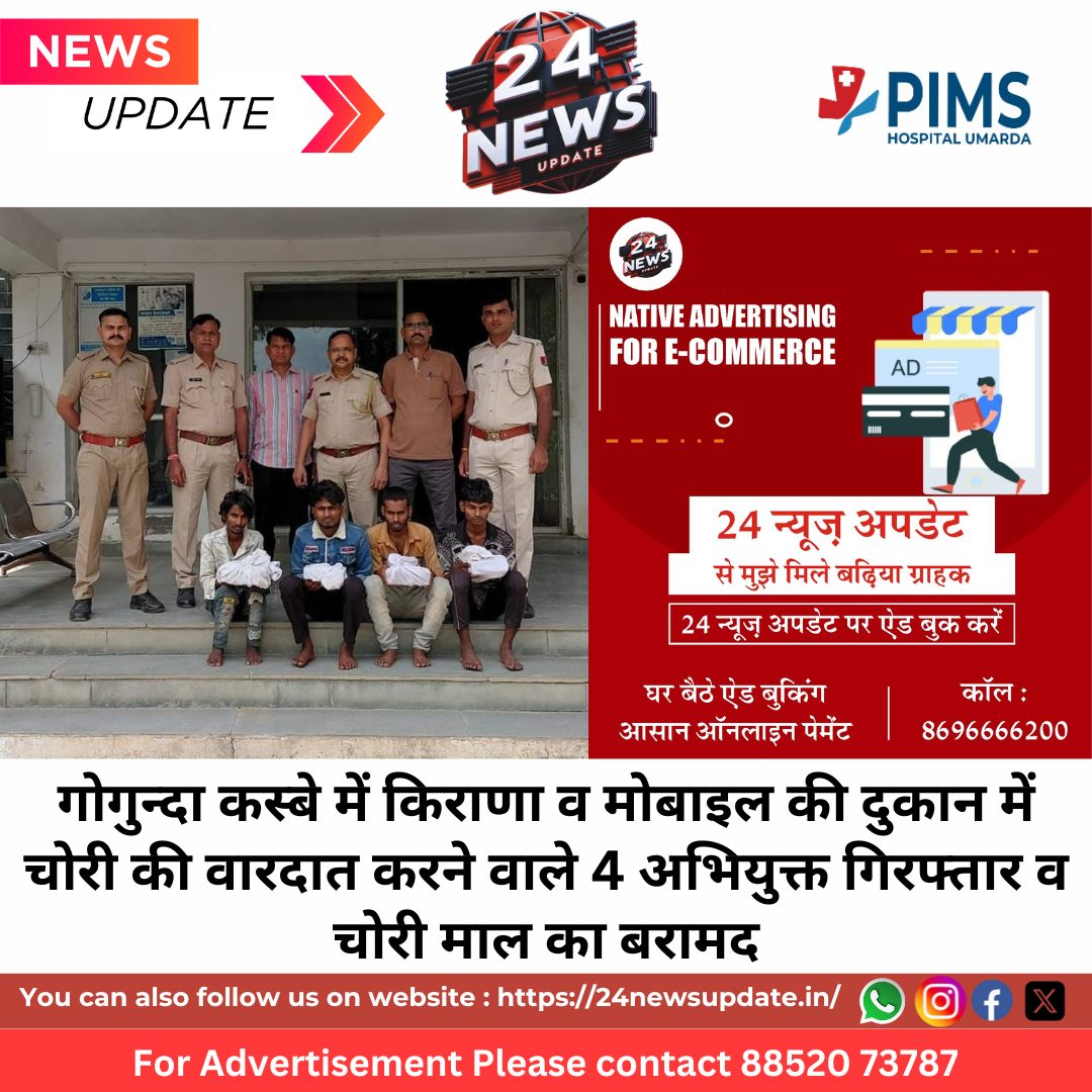 24 News Update थाना गोगुन्दाः- दिनांक 5.09.2025 को प्रार्थी लोकेश कुमार पिता हिरालाल सुराणा उम्र 46 वर्ष निवासी गोगुन्दा जिला उदयपुर ने रिपोर्ट पेश की कि दिनांक 4.09.2025 को रात्री में अज्ञात व्यक्तियों द्वारा उसकी किराणे व मोबाइल की दुकान के छत का गेट तोडकर व अन्दर की तरफ से दीवार तोडकर दुकन में से 15 हजार नगदी, सोने चांदी के आभूषण व 30 मोबाइल चोरी करके ले गये। वगैरा रिपोर्ट पर प्रकरण संख्या 415/2025 धारा 331 (4), 305 (a), बी.एन.एस. 2023 में दर्ज कर अनुसंधान प्रारम्भ किया गया।जिला पुलिस अधीक्षक, उदयपुर योगेश गोयल के निर्देशानुसार श्री गोपाल स्वरूप मेवाडा अतिरिक्त पुलिस अधीक्षक, मुख्यालय एवं श्री सूर्यवीर सिंड वृताधिकारी वृत्त गिर्वा के सुपरविजन में श्याम सिंह थानाधिकारी, गोगुन्दा मय टीम ने आसूचना व तकनीकी सहयोग से प्रकरण खुलासा करते हुये प्रकरण में अभियुक्त 1. मुकेश पिता चुन्नीलाल निवासी उपला भीलवाडा, भुताला 2. किशनलाल पिता प्रतापलाल निवासी नेतावतो की भागल, भुताला, 3. इन्द्रलाल पिता पप्पुडा निवासी डुंगरियो का भीलवाडा, भुताला 04. भग्गालाल पिता तेजिंग निवासी डुंगरियो का भीलवाडा. भुताला थाना गोगुन्दा को डिटेन कर पुछताछ की गई। जिस पर चारो ने मिलकर गोगुन्दा कस्बे में किराणे व मोबाईल की दुकार में किराणे का सामान, सोने चांदी के आभूषण, व 30 पुराने रिपेयरिंग के लिये आये हुये मोबाईल चुराना स्वीकार किया। जिस पर बाद पुछताछ चारो को गिरफ्तार किया गया है। चारो आरोपियों से प्रकरण की घटना का सम्पुर्ण माल मशरूका बरामद किया गया है। चारो आरोपियों ने अपने शौक पूरे करने व मौज मस्ती के लिये चोरी करना स्वीकार किया है। चारो मुल्जिमान पुलिस अभिरक्षा में हो प्रकरण में अग्रिम अनुसंधान जारी है।टीम प्रभारी व सदस्यः- श्री लोकेश रायकवाल कानि. साईबर सैल, उदयपुर। श्याम सिंह थानाधिकारी, गोगुन्दा। बाबूलाल हैड कानि. 883। (विशेष भूमिका) योगेश्वर सिंह हैड कानि. 145। (विशेष भूमिका) मोहम्मद सलीम हैड कानि. 740। देवीलाल कानि. 2852। (विशेष भूमिका) किशोर कुमार कानि. 3107। शिव सिंह कानि. 831 । Share this: Share on X (Opens in new window) X Share on Facebook (Opens in new window) Facebook More Email a link to a friend (Opens in new window) Email Share on WhatsApp (Opens in new window) WhatsApp Like this:Like Loading... Related Discover more from 24 News Update Subscribe to get the latest posts sent to your email. Type your email… Subscribe Post navigation उदयपुर को मिला वेटलैण्ड सिटी का प्रमाण पत्र जीप से नदी के पुलिया को पार करते समय पानी के बहाव में फसें 2 युवको को सिविल डिफेंस टीम व जन सहयोग से सुरक्षित बचाया गया