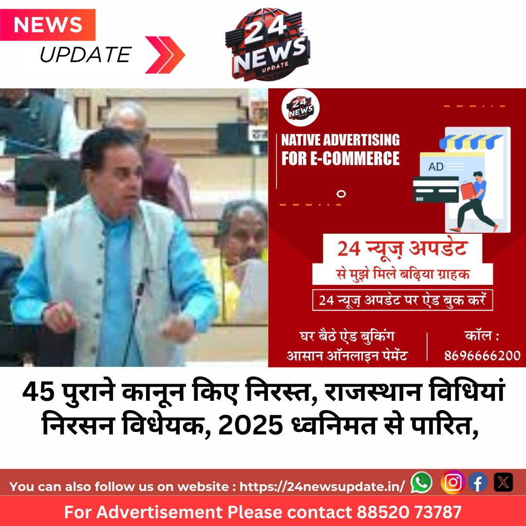 24 न्यूज अपडेट, जयपुर। विधि एवं विधिक संसदीय कार्य मंत्री श्री जोगाराम पटेल ने कहा कि राज्य सरकार जनसामान्य तक विधि प्रणालियों को अधिक सुगमता से पहुंचाने के लिए प्रयासरत है। हमारी सरकार विधियों में सुधार करने के साथ अप्रचलित और अनावश्यक को निरस्त करने की दिशा में आगे बढ़ी है। इससे जनमानस को लाभ मिलेगा और न्याय सुगमता से मिलेगा। पटेल सोमवार को विधान सभा में राजस्थान विधियां निरसन विधेयक, 2025 पर चर्चा के बाद जवाब दे रहे थे। उन्होंने कहा कि पूर्व से ही असम्बद्ध व अप्रचलित विधियों को हटाने के कार्य किए जाते रहे हैं। इस बार भी विभिन्न विभागों से जानकारी जुटाकर सक्षम स्तर से अनुमोदन कराते हुए विधि विभाग ने विधेयक का प्रारूप तैयार किया था। इसके बाद ही विधेयक के जरिए 45 विधियों को हटाया जा रहा है।विधि एवं विधिक संसदीय कार्य मंत्री ने कहा कि इस विधेयक के जरिए राजस्थान सूचना का अधिकार (निरसन) अधिनियम, 2006 को भी हटाया गया है। उन्होंने कहा कि पूरे देश में केंद्र सरकार की विधियों के अनुरूप ही ‘सूचना का अधिकार‘ प्रभावी है। ऐसे में राजस्थान में यह अधिनियम न्याय संगत नहीं है। पटेल ने बताया कि राजस्थान विधान सभा में पहले भी अप्रचलित विधियां निरस्त की गई हैं। इनमें वर्ष 1954 में 31, वर्ष 1962 में 221, वर्ष 1997 में 303, वर्ष 2015 में 248 और वर्ष 2023 में 123 विधियां हटाई गई थीं। उन्होंने कहा कि यशस्वी प्रधानमंत्री नरेंद्र मोदी के नेतृत्व में ‘मिनिमम गवर्नमेंट मैक्सिमम गनर्वेंस‘ अनुरूप देश में चहुमुंखी प्रगति सुनिश्चित की जा रही है। इस अनुसार लॉ कमीशन बना और इसी के जरिए 1 हजार 600 कानून रिपील किए गए।विधि एवं विधिक संसदीय कार्य मंत्री ने बताया कि इस बिल में पंचायती राज के 37, स्वायत्त शासन के 5, प्रशासनिक सुधार विभाग, कृषि विभाग, उद्योग एवं वाणिज्य विभाग के 1 निरसन किए गए हैं। चर्चा के बाद सदन ने राजस्थान विधियां निरसन विधेयक, 2025 को ध्वनिमत से पारित कर दिया। Share this: Share on X (Opens in new window) X Share on Facebook (Opens in new window) Facebook More Email a link to a friend (Opens in new window) Email Share on WhatsApp (Opens in new window) WhatsApp Like this:Like Loading... Related Discover more from 24 News Update Subscribe to get the latest posts sent to your email. Type your email… Subscribe Post navigation अवैध खनन के खिलाफ खान विभाग की आकस्मिक बड़ी कार्रवाई करते हुए 70 करोड़ 37 लाख के जुर्माने के साथ ही 3 एफआईआर दर्ज जेल प्रहरी भर्ती परीक्षा 2018ः टीसीएस के प्रोजेक्ट मैनेजर ने उपलब्ध कराए थे पेपर,60 लाख रुपये की डील, प्रोजेक्ट मैनेजर जगजीत सिंह समेत दो आरोपी गिरफ्तार
