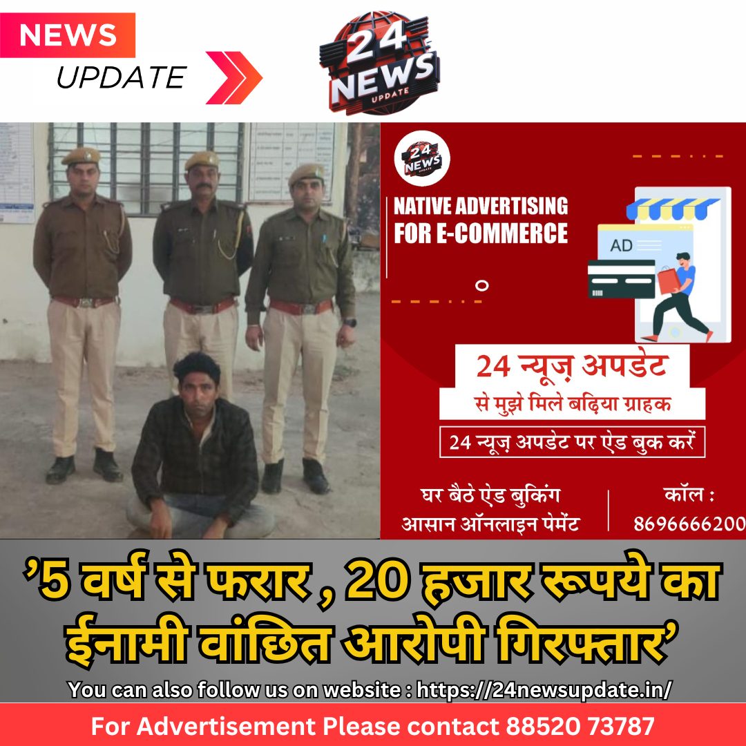 24 न्यूज अपडेट.चित्तौड़गढ़। भदेसर थाना पुलिस ने पांच वर्ष से फरार बीस हजार रुपए के ईनामी बालोतरा जिले पचपदरा तथा पाली जिले के सांडेराव थाने के एनडीपीएस प्रकरण में वांछित आरोपी को गिरफ्तार किया है। पुलिस अधीक्षक सुधीर जोशी ने बताया कि पुलिस मुख्यालय राजस्थान जयपुर द्वारा अवैध मादक पदार्थो की तस्करी मे वांछित अपराधियों की धरपकड़ हेतु चलाये जा रहे अभियान में अधिकाधिक कार्यवाही हेतु निर्देश दिये जाकर सरिता सिंह अतिरिक्त पुलिस अधीक्षक चित्तौडगढ के नेतृत्व तथा अनिल कुमार शर्मा , वृताधिकारी भदेसर के निकटतम सुपर विजन में धर्मराज थानाधिकारी थाना भदेसर के नेतृत्व में वांछित मुल्जिमों की तलाश हेतु एक पुलिस टीम गठित की गई। टीम द्वारा अतिरिक्त महानिदेशक अपराध शाखा राजस्थान जयपुर तथा पुलिस अधीक्षक जिला बालोतरा के आदेशानुसार 20 हजार रूपये के ईनामी वांछित अभियुक्त प्रहलाद उर्फ मुन्ना पिता माधुलाल जाट निवासी सोनियाना थाना भदेसर जिला चितोडगढ को टीम द्वारा आसुचना संकलन करते हुए दिनांक 28 जनवरी 2025 को सुरपुर रोड़ सरहद सोनियाणा से डिटेन किया गया। आरोपी बालोतरा जिले के पचपदरा थाने के करीब 06 क्विंटल अफीम डोडाचुरा व आर्म्स एक्ट तथा पाली जिले के सांडेराव थाने मे 01 किलो 500 ग्राम अफीम तस्करी के प्रकरण में वांछित है आरोपी को अग्रीम कार्यवाही हेतु पुलिस थाना पचपदरा जिला बालोतरा को सुपूर्द किया गया। अभियुक्त प्रहलाद उर्फ मुन्ना की गिरफ्तारी पर पुलिस अधीक्षक बालोतरा के द्वारा 20 हजार रूपये का ईनाम जारी किया गया था । पुलिस टीम में धर्मराज थानाधिकारी , एएसआई मुकेश कुमार कानि. विकास ,विजय (विशेष योगदान),नरेन्द्र शामिल थे।