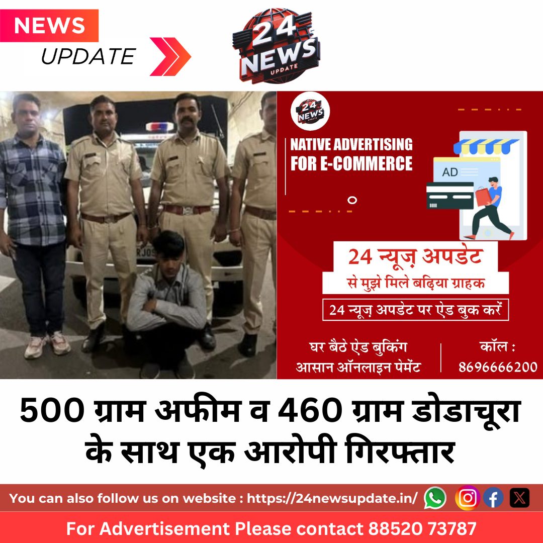 24 न्यूज़ अपडेट चित्तौड़गढ़। जिले की मंगलवाड़ थाना पुलिस ने थाना क्षेत्र में गश्त के दौरान एक व्यक्ति के कब्जे से 500 ग्राम अवैध अफीम व 460 ग्राम अवैध डोडाचूरा जब्त कर आरोपी को गिरफ्तार किया है। जिला पुलिस अधीक्षक श्री सुधीर जोशी ने बताया कि जिले में अवैध मादक पदार्थों की तस्करी के विरूद्ध कार्यवाही के समस्त थानाधिकारियों को निर्देश दिए गए। इसी क्रम में एएसपी चित्तौड़गढ़ सरितासिंह के निर्देशन व डीएसपी बडीसादडी देशराज कुलदीप के सुपरविजन में बुधवार को एसएचओ मंगलवाड भगवानलाल पु.नि. व पुलिस जाप्ता कानि. राकेश कुमार, सुनिल कुमार, उम्मेदसिंह व राजेन्द्र के साथ थाना क्षेत्र में गश्त करता हुआ मंगलवाड चितौडगढ हाईवे रोड ब्रीज के नीचे पहुंचे, जहां एक व्यक्ति पुलिस जाप्ता को देखकर भागने का प्रयास करने लगा, जिसे पकडकर नाम पता पूछा तो अपना नाम जयपुर जिले के बिलौची थाना दौलतपुरा निवासी 30 वर्षीय शंकरलाल पुत्र रामनाथ जाट होना बताया। जिसकी तलाशी लेने पर आरोपी के कब्जेशुदा बैग से 500 ग्राम अवैध अफीम व 460 ग्राम अवैध अफीम डोडाचूरा जब्त किया जाकर आरोपी शंकर लाल को मौके पर ही गिरफ्तार किया गया।