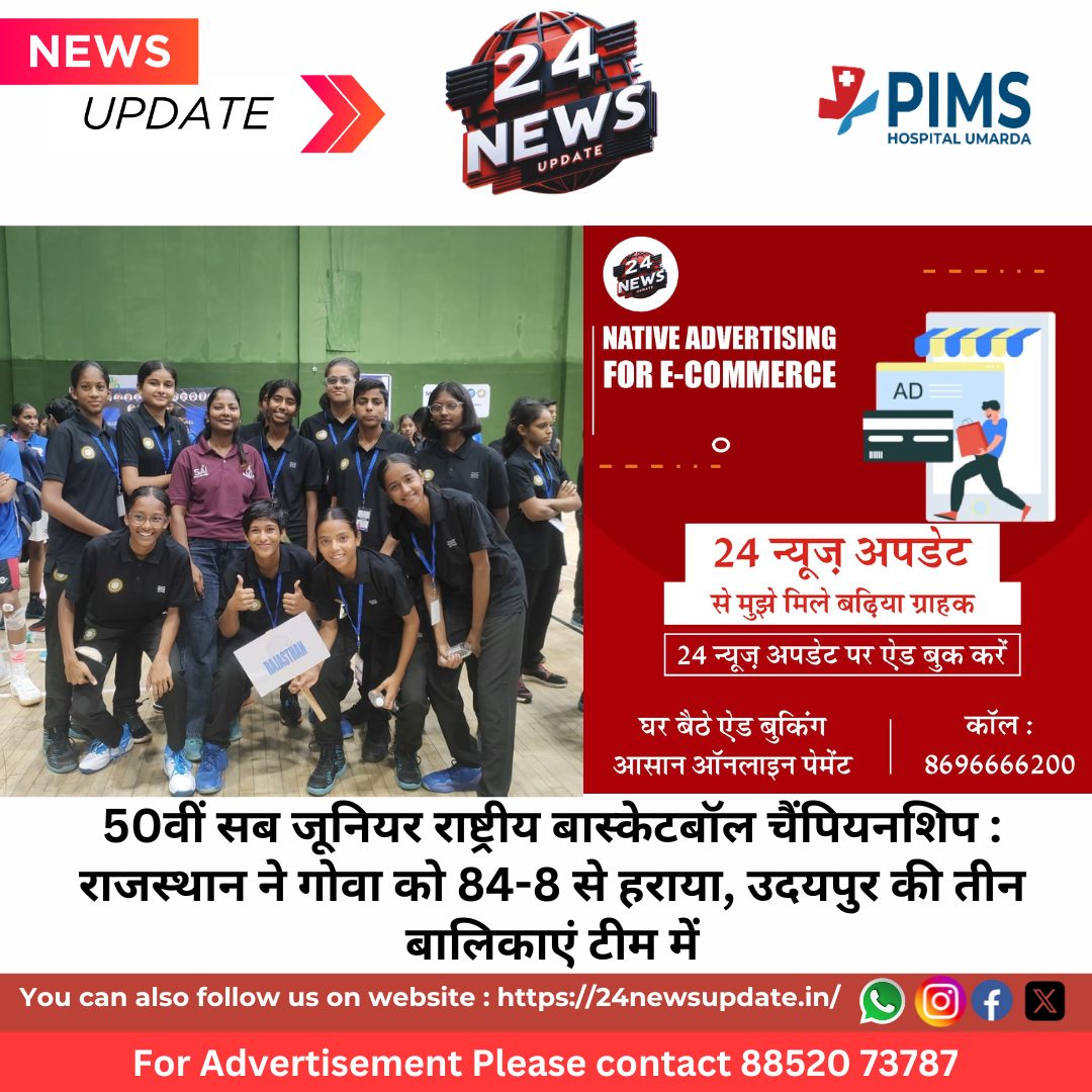 24 News Update उदयपुर। देहरादून (उत्तराखंड) में आयोजित 50वीं सब जूनियर राष्ट्रीय बास्केटबॉल चैंपियनशिप (बालिका वर्ग) के उद्घाटन सत्र में राजस्थान टीम ने शानदार प्रदर्शन करते हुए गोवा को 84-8 के विशाल अंतर से पराजित कर अगले दौर में जगह बना ली।
