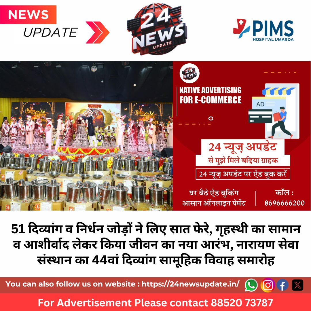 24 news Update उदयपुर। नारायण सेवा संस्थान के सेवा महातीर्थ, लियों का गुड़ा में रविवार को आयोजित दो दिवसीय 44वें नि:शुल्क दिव्यांग एवं निर्धन सामूहिक विवाह समारोह का समापन हुआ। इस दौरान देश के विभिन्न राज्यों से पहुंचे 51 नवविवाहित दिव्यांग और निर्धन जोड़ों ने वैदिक मंत्रोच्चारण के बीच अग्नि को साक्षी मानकर सात फेरे लिए। समारोह में हजारों की संख्या में संस्थान के सहयोगी, दानदाता, कन्यादानी, परिजन और अतिथि शामिल हुए।