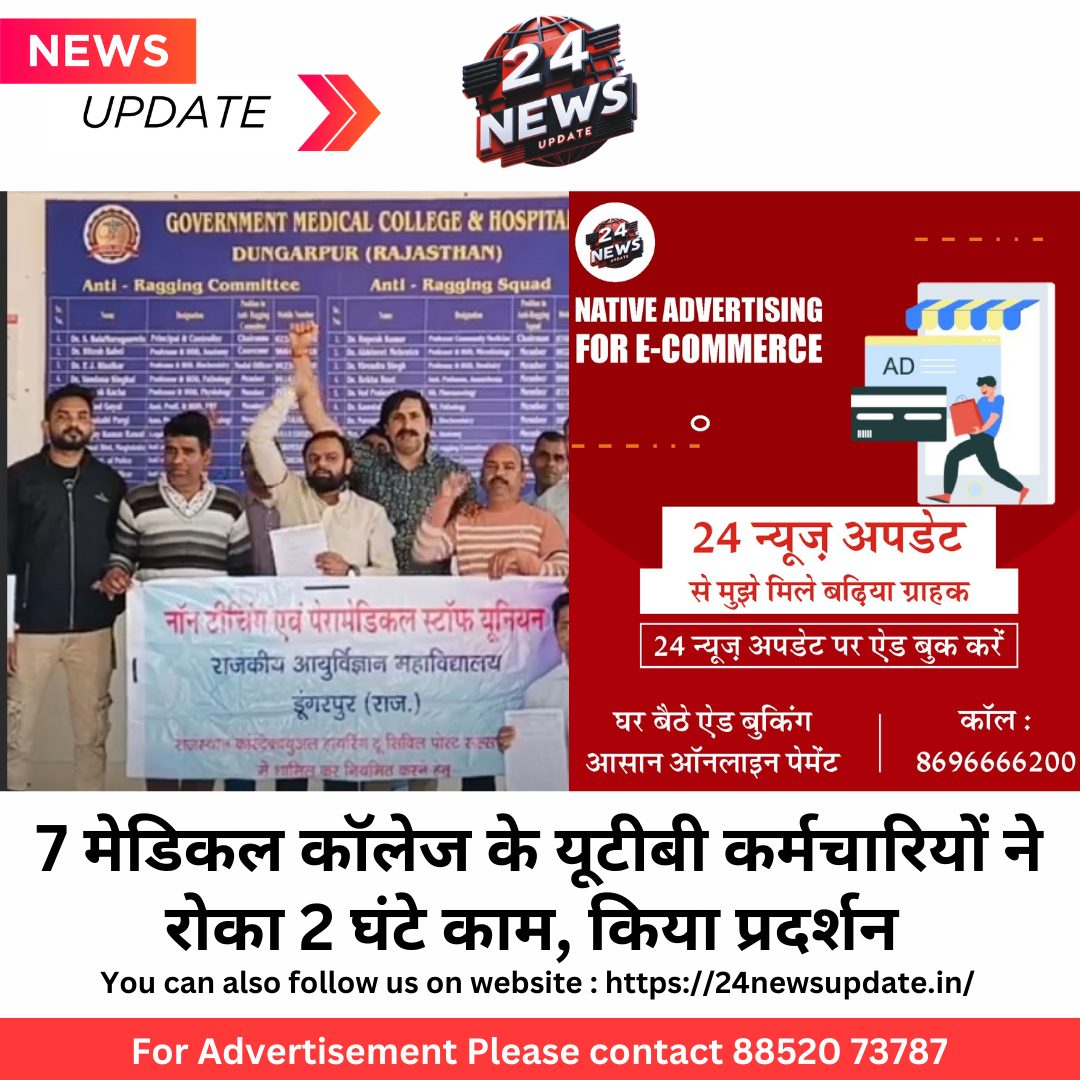 24 न्यूज अपडेट. डूंगरपुर। स्थायी नियुक्ति और वेतन वृद्धि की मांग को लेकर 7 मेडिकल कॉलेज के यूटीबी कर्मचारियों ने प्रदर्शन किया। स्थायी नियुक्ति और वेतन वृद्धि की मांग को लेकर 7 मेडिकल कॉलेज के यूटीबी कर्मचारियों का प्रदर्शन। डूंगरपुर समेत प्रदेश के 7 मेडिकल कॉलेज के यूटीबी कार्मिक आंदोलन पर उतर गए हैं। यूटीबी कार्मिकों ने मंगलवार को 2 घंटे का कार्य बहिष्कार कर दिया। काली पट्टी बांधकर नारेबाजी की। यूटीबी कार्मिकों ने स्थाई करने, सीएसआर रूल्स में शामिल करने ओर वेतन बढ़ाने समेत कई मांगे रखी। मेडिकल कॉलेज डूंगरपुर के यूटीबी कार्मिकों ने मंगलवार सुबह से 2 घंटे के लिए कार्य बहिष्कार कर दिया। यूटीवी कार्मिकों ने पाने कपड़ों पर काली रिबन बांधी और नियमित करने की मांग को लेकर जमकर प्रदर्शन किया। वहीं, 2 घंटे बहिष्कार के चलते कई कामकाज ठप रहे। यूटीबी कार्मिक संघ के अध्यक्ष रोहित चौबीसा, प्रभु पांडे, योगेश चौबीसा समेत कई कार्मिकों ने बताया कि राजमेस से संचालित प्रदेश के 7 मेडिकल कॉलेज में यूटीबी कार्मिकों से साथ कुठाराघात किया जा रहा है। 2017-18 में मेडिकल कॉलेज खुलने के साथ ही नियमानुसार सभी यूटीवी कार्मिकों की भर्ती की गई थी, लेकिन यूटीबी कार्मिकों को आज तक कभी वेतन बढ़ोतरी का लाभ मिलना तो दूर सरकार के सीएसआर रूल्स 2022 में भी शामिल नहीं किया गया है। जबकि यूटीबी कार्मिक 7 सालों से मेडिकल कॉलेज में नियमित कर्मचारी की तरह सेवाएं दे रहे हैं। कोरोनाकाल में भी कर्मचारियों ने स्वास्थ्य से जुड़े सभी काम किए।उन्होंने बताया कि सीएसआर रूल्स 2022 को लेकर आयोजित राज्य स्तरीय बैठक में भी मेडिकल कॉलेज यूटीबी कार्मिकों को शामिल करने के लिए अनुमोदन किया गया है। एक सामान पद पर कार्य करने के बावजूद सरकार की ओर से सौतेला व्यवहार किया जा रहा है। यूटीबी कार्मिकों ने कहा कि सरकार डूंगरपुर समेत बाड़मेर, भरतपुर, भीलवाड़ा, शुरू, पाली ओर सीकर मेडिकल कॉलेज में यूटीबी पर कार्यरत कर्मचारियों को सीएसआर रूल्स 2022 में शामिल करने, परमानेंट करने ओर वेतन बढ़ाने की मांग रखी है। वहीं, मांग पूरी नहीं होने तक 2 घंटे का कार्य बहिष्कार किया जायेगा। वहीं, आगे आंदोलन को उग्र किया जा सकता है। Share this: Share on X (Opens in new window) X Share on Facebook (Opens in new window) Facebook More Email a link to a friend (Opens in new window) Email Share on WhatsApp (Opens in new window) WhatsApp Like this:Like Loading... Related Discover more from 24 News Update Subscribe to get the latest posts sent to your email. Type your email… Subscribe Post navigation …..तो फिर कहां से आया हिन्दी वाला फर्जी निमंत्रण पत्र!!! बणेश्वर धाम में निमंत्रण पत्र पर विवादः सांसद राजकुमार रोत के ट्विट से मचा बवाल कंटेनर में थी पानी की टंकियां, जिनमें छिपाकर हो रही थी 12 लाख की शराब की तस्करी
