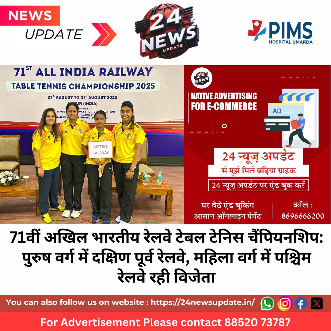 24 News Update जयपुर, 29 अगस्त। उत्तर पश्चिम रेलवे खेलकूद संगठन के तत्वावधान में रेलवे ऑफिसर्स क्लब, जगतपुरा, जयपुर में आयोजित 71वीं अखिल भारतीय रेलवे टेबल टेनिस चैंपियनशिप 2025-26 में शुक्रवार को टीम स्पर्धाओं के फाइनल मुकाबले खेले गए।