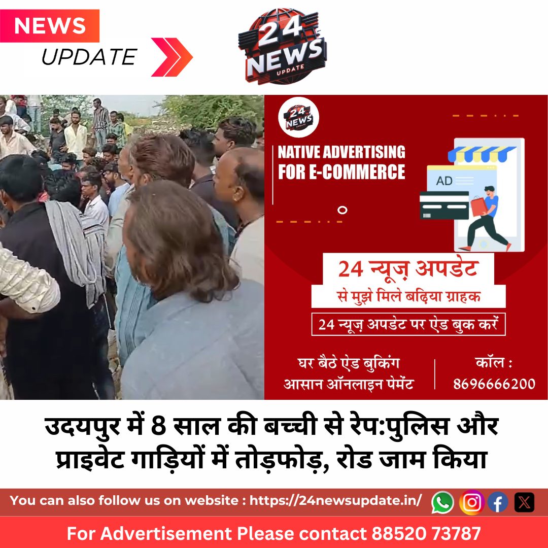 24 News Update. उदयपुर में 8 साल की बच्ची से रेप के बाद स्थानीय लोग उग्र हो गए। डबोक थाने के सामने बड़ी संख्या में लोग जुटे हैं। पुलिस और अन्य प्राइवेट गाड़ियों में तोड़फोड़ की। उदयपुर-डबोक सर्विस रोड जाम कर दिया है। बिगड़ते हालात को देखते हुए आला अफसरों के साथ ही तीन थानों की पुलिस को मौके पर बुलाया गया है। पूरा इलाका छावनी में तब्दील हो गया है। फिलहाल हालात तनावपूर्ण बने हुए हैं। थानाधिकारी हुकम सिंह ने बताया- बच्ची रविवार की शाम करीब 7:30 बजे खेत पर गई थी। तभी एक व्यक्ति वहां आया और मुंह दबाकर बच्ची को पास की झाड़ियों की तरफ ले गया। फिर डरा-धमकाकर उसके साथ रेप किया। घटना के बाद आरोपी फरार हो गया। बदहवास बच्ची जैसे-तैसे घर पहुंची। परिजनों को पूरी घटना बताई। बच्ची की हालत बिगड़ता देख उसे एमबी हॉस्पिटल में भर्ती कराया गया है। उसकी स्थिति सामान्य है। बसों में तोड़फोड़ और रोड किया जामसोमवार सुबह बड़ी संख्या में गांव वाले डबोक थाने पहुंचे। उन्होंने आरोपी को जल्दी पकड़ने की मांग की। इसी दौरान भीड़ भड़क गई और उदयपुर-डबोक सर्विस लेन से निकल रही बसों में तोड़फोड़ शुरू कर दिया। कुछ ही देर बाद रोड जाम कर दिया। गाड़ियों की लंबी लाइन लग गई। माहौल गर्माता देख एडिशनल एसपी गोपाल स्वरूप मेवाड़ा, एसडीएम रमेश सिरवी सहित घासा, मावली और फतहनगर थानों से अतिरिक्त पुलिस बल तैनात किया गया। एफएसएल और डॉग स्क्वायड टीम जुटा रही सबूतथानाधिकारी ने बताया कि बच्ची ज्यादातर अपनी मां के साथ ही जाती थी। रविवार को वह अकेली चली गई। मौके से एफएसएल और डॉग स्क्वॉयड की टीम ने सबूत जुटाए। आसपास के इलाकों के सीसीटीवी भी खंगाले जा रहे हैं। जल्दी ही आरोपी को गिरफ्तार कर लिया जाएगा। Share this: Share on X (Opens in new window) X Share on Facebook (Opens in new window) Facebook More Email a link to a friend (Opens in new window) Email Share on WhatsApp (Opens in new window) WhatsApp Like this:Like Loading... Related Discover more from 24 News Update Subscribe to get the latest posts sent to your email. Type your email… Subscribe Post navigation पदमप्रभु दिगंबर जैन मंदिर पायडा में 16 दिवसीय शांति विधान का समापन उदयपुर में बेटे ने पिता को मार डाला:हाल ही में जमीन बेची थी, रकम देने में आना-कानी की तो बेटे ने सिर पर डंडा मारा