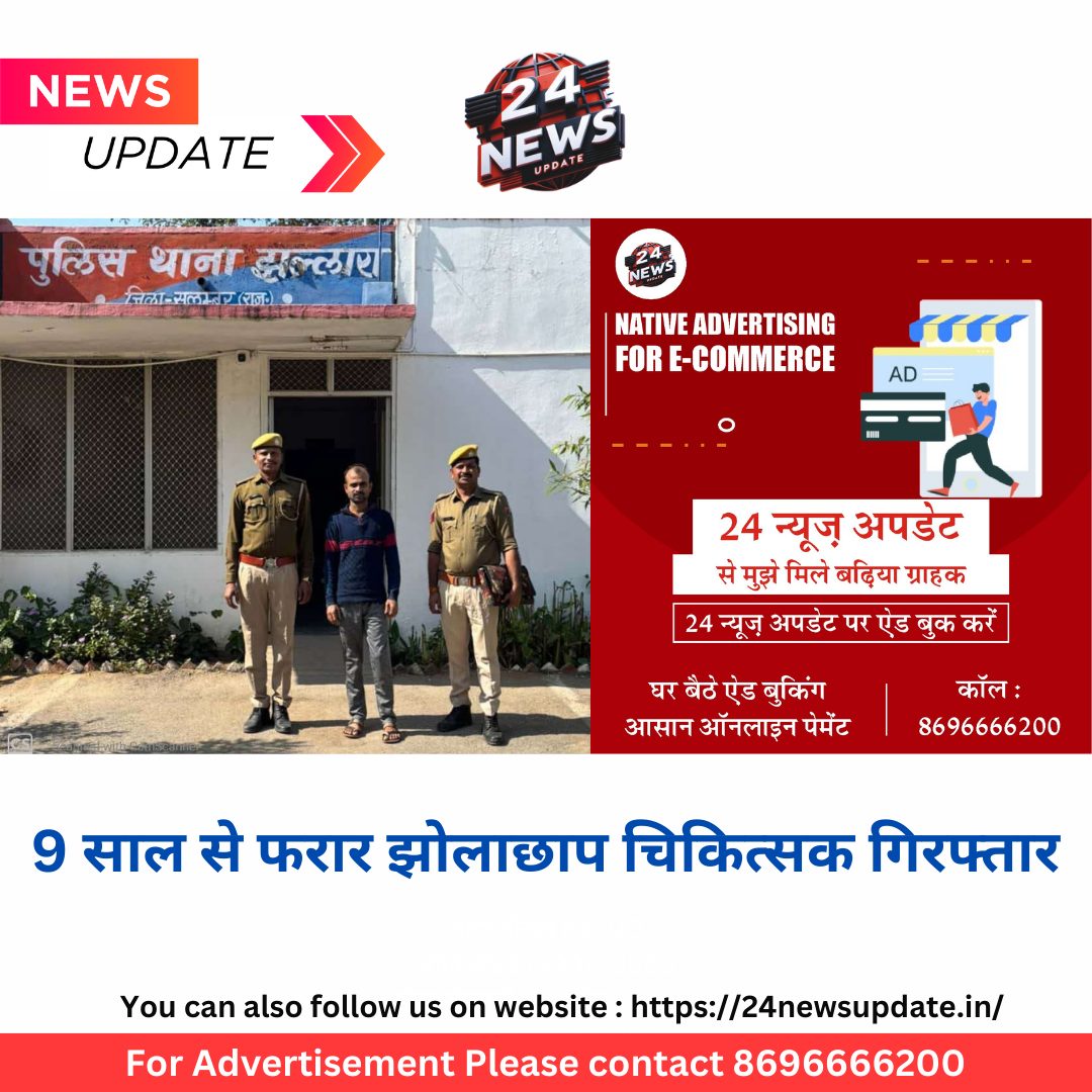 24 न्यूज़ अपडेट सलूंबर. सलूंबर जिले के झल्लारा थाना पुलिस ने 9 साल से फरार झोलाछाप चिकित्सक को गिरफ्तार किया है । जानकारी के अनुसार
