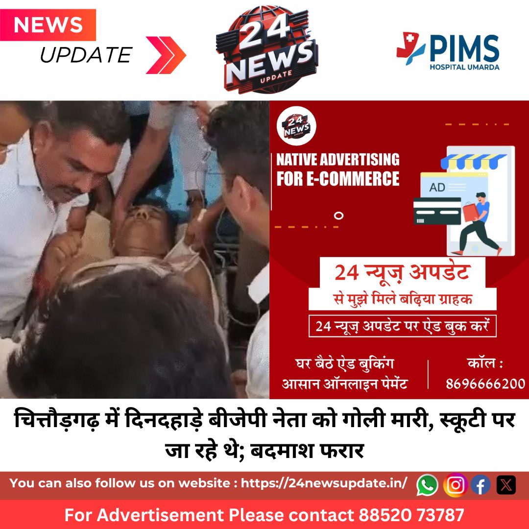 24 News Update चित्तौड़गढ़. मंगलवार सुबह एक सनसनीखेज वारदात हुई। दिनदहाड़े बाइक सवार बदमाश ने बीजेपी नेता को गोली मार दी। घटना के समय वे स्कूटी पर जा रहे थे। इस दौरान हेलमेट पहने बदमाश ने फायरिंग की और मौके से फरार हो गया।