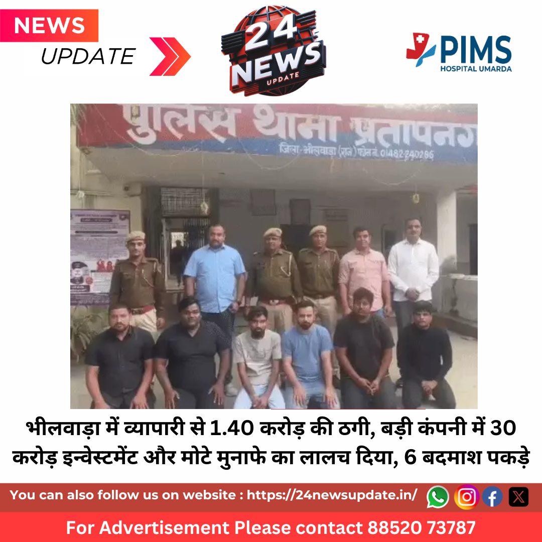 24 News Update भीलवाड़ा. भीलवाड़ा में एक कपड़ा व्यापारी को एक कंपनी में 30 करोड़ रुपए का निवेश और मोटे मुनाफे का झांसा देकर प्रोसेसिंग फीस के नाम पर 1 करोड़ 40 लाख रूपए की ठगी के मामले का पुलिस ने पर्दाफाश कर दिया है। मामले में गैंग का खुलासा करते हुए 6 बदमाशों को गिरफ्तार किया गया है।