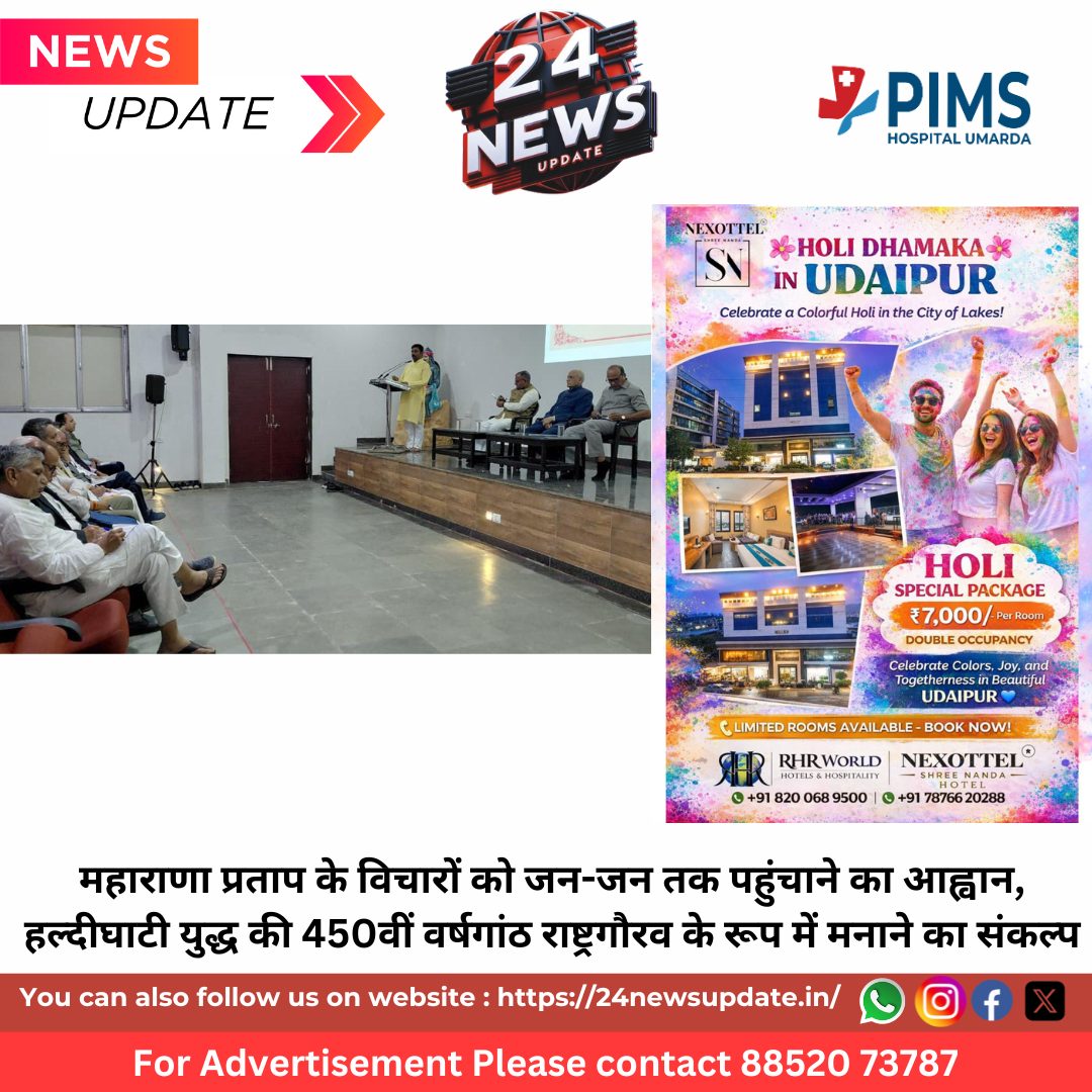 24 News Update उदयपुर। राष्ट्रीय स्वयंसेवक संघ के क्षेत्र प्रचारक निम्बाराम ने कहा कि वीर शिरोमणि महाराणा प्रताप के आदर्शों और राष्ट्रनिष्ठ विचारों को जन-जन तक पहुंचाना समय की आवश्यकता है। उन्होंने कार्यकर्ताओं से आह्वान किया कि वे घर-घर तक महाराणा प्रताप के प्रेरक जीवन और आदर्शों को पहुंचाने के लिए पूर्ण समर्पण के साथ कार्य करें।वे शनिवार को उदयपुर स्थित प्रताप गौरव केन्द्र में आयोजित वीर शिरोमणि महाराणा प्रताप समिति की साधारण सभा की वार्षिक बैठक को संबोधित कर रहे थे। बैठक में आगामी 18 जून 2026 को हल्दीघाटी का युद्ध की 450वीं वर्षगांठ को राष्ट्रगौरव के रूप में भव्य रूप से मनाने का संकल्प लिया गया।प्रताप गौरव केन्द्र के निदेशक अनुराग सक्सेना ने बताया कि समिति की बैठक पद्मिनी सभागार में समिति अध्यक्ष प्रो. भगवती प्रकाश शर्मा की अध्यक्षता में आयोजित हुई। बैठक में निर्णय लिया गया कि वर्षगांठ के अवसर पर शोधपरक कार्यक्रम, सांस्कृतिक आयोजन, युवाओं के लिए प्रतियोगिताएं, व्याख्यानमाला, युवा सम्मेलन, ऐतिहासिक प्रदर्शनी और जनजागरण अभियान आयोजित किए जाएंगे।बैठक में सीए महावीर चपलोत ने आयोजनों के लिए क्राउड फंडिंग के माध्यम से जनसहयोग जुटाने का सुझाव दिया, जिस पर सदस्यों ने सकारात्मक चर्चा की। इस दौरान ओंकार सिंह लखावत, कैलाश सोढ़ानी, डॉ. देव कोठारी, डॉ. मन्नालाल रावत, पारस सिंघवी, गोविंद सिंह टांक, मुरलीधर, डॉ. धर्मेन्द्र सिंह राठौड़ और हनुमान सिंह राठौड़ सहित कई सदस्यों ने विचार रखे। समिति के वर्षभर के कार्यों का प्रतिवेदन महामंत्री पवन शर्मा ने प्रस्तुत किया, जबकि कोषाध्यक्ष अशोक पुरोहित ने वित्तीय स्थिति और आगामी बजट की जानकारी दी।नई कार्यकारिणी का गठनसाधारण सभा में आगामी दो वर्षों के लिए समिति की नई कार्यकारिणी का गठन भी किया गया। अध्यक्ष पद पर प्रो. भगवती प्रकाश शर्मा पुनः निर्वाचित हुए। चुनाव प्रक्रिया चुनाव अधिकारी मदन मोहन टांक की देखरेख में सम्पन्न हुई। घोषित कार्यकारिणी में उपाध्यक्ष के रूप में सुभाष भार्गव, सुहास मनोहर, अशोक पुरोहित, पवन शर्मा और पारस सिंघवी को दायित्व दिया गया। महामंत्री का दायित्व दीपक कुमार शुक्ल संभालेंगे, जबकि कोषाध्यक्ष के रूप में डॉ. महावीर चपलोत नियुक्त हुए हैं। मंत्री पद पर प्रो. मदन सिंह राठौड़ और रमन सूद रहेंगे तथा प्रचार मंत्री का दायित्व जयदीप आमेटा को सौंपा गया है। सदस्यों में चंद्रगुप्त सिंह चौहान, प्रो. अनिल कोठारी, प्रो. गायत्री स्वर्णकार, डॉ. मन्नालाल रावत, अभय सिंह राठौड़, नरेन्द्र मीणा और रुचि श्रीमाली को शामिल किया गया है। बैठक के अंत में अध्यक्ष प्रो. भगवती प्रकाश शर्मा ने सभी सदस्यों का आभार व्यक्त करते हुए कहा कि क्षेत्र 