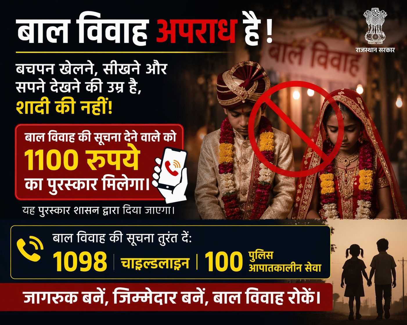 24 News Update उदयपुर, 17 अप्रैल। आगामी 19 अप्रैल एवं 1 मई को अक्षय तृतीया, पीपल पूर्णिमा पर अबूझ सावों पर बाल विवाह होने की अधिक संभावना के मद्देनजर जिला प्रशासन, बाल अधिकारिता विभाग, गायत्री सेवा संस्थान तथा जस्ट राइट फॉर चिल्ड्रन एलाइंस नई दिल्ली के संयुक्त तत्वावधान एक महीने का बाल विवाह मुक्त उदयपुर अभियान प्रारंभ किया गया। अभियान की शुरुआत शुक्रवार को राजकीय किशोर गृह के सभागार में बाल अधिकारिता विभाग द्वारा आयोजित बैठक में अभियान से संबंधित पोस्टर विमोचन के साथ हुई।बैठक की अध्यक्षता करते हुए जिला विधिक सेवा प्राधिकरण उदयपुर के सचिव कुलदीप शर्मा ने कहा कि बाल विवाह एक कानूनी अपराध है एवं इसकी रोकथाम हेतु कड़े कदम उठाते हुए सख्त कार्रवाई सुनिश्चित की जाएगी एवं यह तभी संभव होगा जब सभी विभाग अपनी-अपनी जिम्मेदारियां को तत्परता के साथ निभाएंगे।बैठक में उपनिदेशक बाल अधिकारिता विभाग के. के. चंद्रवंशी ने बताया कि प्रशासन इस अभियान को सफल बनाने हेतु पूर्ण रूप से प्रयासरत रहते हुए हमेशा अलर्ट मोड में कार्य कर रहा है। बैठक में विवाह में भागीदार विभिन्न स्टैक होल्डर हलवाई, बैंड, फोटोग्राफर आदि को बुला कर उन्हें बाल विवाह कानून से अवगत करवाया गया। इस अवसर पर गायत्री सेवा संस्थान के समन्वयक नितिन पालीवाल ने अभियान की जानकारी देते हुए बताया कि इस अभियान के तहत संस्थान द्वारा एक हेल्प लाइन की शुरूआत की गई जिसका न. 8239999288 हैं जिसके माध्यम से आप बाल विवाह की सूचना दे सकते हैं। सूचना देने वाले की पहचान गोपनीय रखी जाएगी एवं सूचना का सत्यापन होने पर 1100 रूपए नकद पुरस्कार दिया जाएगा।अंत में चाइल्ड हेल्प लाइन के जिला समन्वयक नवनीत औदिच्य ने बताया कि विभाग द्वारा टीम गठित कर सक्रिय रूप से कार्य किया जा रहा हैं एवं विभाग द्वारा संचालित चाइल्ड हेल्पलाइन 1098 पर भी शिकायत कर सकते हैं। बैठक में जिला बाल कल्याण समिति, चाइल्ड हेल्पलाइन, शिक्षा विभाग, श्रम विभाग, चिकित्सा विभाग, मानव तस्करी विरोधी यूनिट गायत्री सेवा संस्थान एवं बच्चों के लिए कार्य कर रही सभी स्वयं सेवी संस्थाओं के प्रतिनिधि उपस्थित थे। Share this: Share on X (Opens in new window) X Share on Facebook (Opens in new window) Facebook More Email a link to a friend (Opens in new window) Email Share on WhatsApp (Opens in new window) WhatsApp Like this:Like Loading... Related Discover more from 24 News Update Subscribe to get the latest posts sent to your email. Type your email… Subscribe Post navigation 4 वर्षों से फरार अभियुक्ता गिरफ्तार, बावलवाड़ा पुलिस की कार्रवाई जनगणना-2027: फील्ड ट्रेनर्स को दिए गए प्रशिक्षण, प्रगणकों-सुपरवाइजर की भूमिका पर जोर