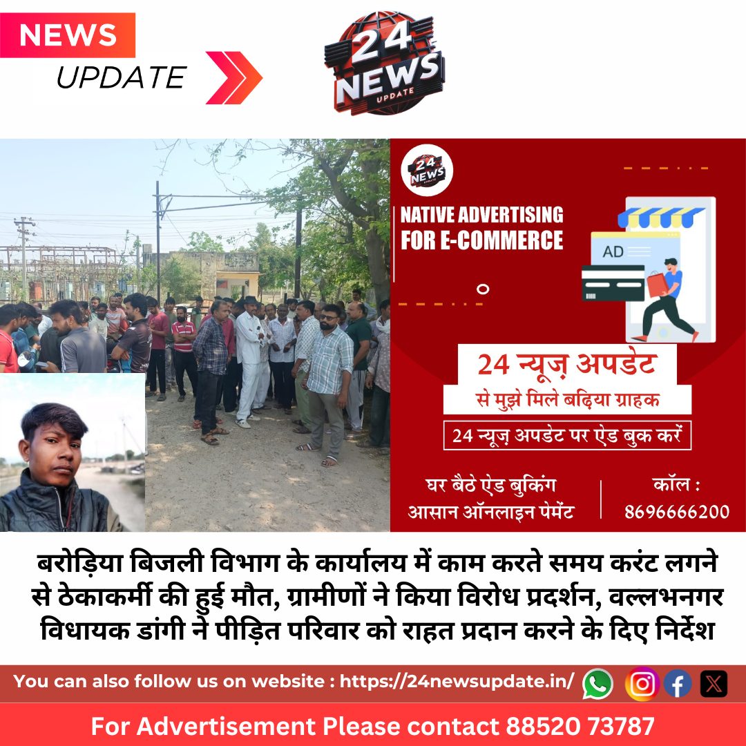 भटेवर अस्पताल में पुलिस प्रशासन ने की समझाइश, 10 लाख के मुआवजे के आश्वासन पर शांत हुआ माहौल 24 News Update भटेवर. वल्लभनगर उपखंड क्षेत्र के बरोड़िया बिजली विभाग के कार्यालय में काम करते समय करंट की चपैट में आने से एक ठेकाकर्मी युवक की मौत हो गई। इसके बाद समाजजनों एवं ग्रामीणों ने विरोध प्रदर्शन करके पीड़ित परिवार को मुआवजा राशि दिलाने की मांग की। जानकारी के अनुसार 12 मई को बरोड़िया जीएसएस पर काम करते समय गजेंद्र सेन करंट की चपेट में आने से जुलस कर गंभीर घायल हो गया। जिसको बाद में एमबी अस्पताल में उपचार के लिए भर्ती करवाया गया। जहां उपचार के दौरान गजेंद्र सेन पिता लोगर लाल सेन निवासी बरोड़िया उम्र 31 साल की मौत हो गई। एमबी अस्पताल में खेरोदा एवं भींडर थाना पुलिस ने पोस्टमार्टम करवा कर शव परिजनों को सुपुर्द कर दिया। युवक की मौत होने की सूचना मिलने के बाद बरोड़िया सरपंच भेरूसिंह राणावत एवं बड़ी तादाद में समाजजन व ग्रामीण वाना बिजली विभाग के कार्यालय पहुंच गए। इसके बाद सेन समाज के लोगों ने कार्यालय के बाहर उग्र विरोध प्रदर्शन शुरू कर दिया। इधर ग्रामीणों के विरोध को देखते हुए पुलिस प्रशासन द्वारा शव को एंबुलेंस की सहायता से भटेवर अस्पताल की मोर्चरी में रखवाया। ग्रामीणों ने हादसे के बारे में विधायक उदयलाल डांगी को सूचित किया। विधायक डांगी ने पुलिस प्रशासन, बिजली विभाग के कार्मिको से बात करके पीड़ित परिवार को सहायता प्रदान करने के निर्देश दिए। भटेवर अस्पताल में खेरोदा थानाधिकारी सुरेश विश्नोई, भींडर थानाधिकारी पुनाराम गुर्जर द्वारा ग्रामीणों व समाजजनों से समझाइस की गई। इस दौरान नवानिया सरपंच जगदीश चन्द्र सेन, विधायक प्रतिनिधि प्रकाश सेन, भटेवर उपसरपंच प्रतिनिधि दुर्गेश सेन, देवीलाल सेन एवं समाजजनों ने पीड़ित परिवार को मुआवजा राशि व परिवार के एक सदस्य को नोकरी देने की मांग की। ठेकेदार व समाजजनों द्वारा बात करने पर पीड़ित परिवार को 10 लाख रुपए का मुआवजा देने व परिवार के एक सदस्य को ठेकेदारी में नियमित नोकिरी देने की बात पर सहमति बनी। वही सहायक अभियंता भास्कर रैगर द्वारा विभाग की तरफ से सरकारी सहायता दिलाने का आश्वासन दिया। इसके बाद पुलिस प्रशासन द्वारा शव को बरोड़िया मोक्षधाम में पहुंचाया गया। जहां पर पुलिस प्रशासन, समाजजनों व ग्रामीणों की मौजूदगी में युवक का अंतिम संस्कार किया गया। Share this: Share on X (Opens in new window) X Share on Facebook (Opens in new window) Facebook More Email a link to a friend (Opens in new window) Email Share on WhatsApp (Opens in new window) WhatsApp Like this:Like Loading... Related Discover more from 24 News Update Subscribe to get the latest posts sent to your email. Type your email… Subscribe Post navigation ओल्ड सिटी में वीकेंड पर 6 से 10 पैदल या़त्री क्षेत्र, ट्रैफिक मैनेजमेंट में एआई की एंट्री, नाइट मार्केट पर विचारों के बादल विधानसभा अध्यक्ष वासुदेव देवनान