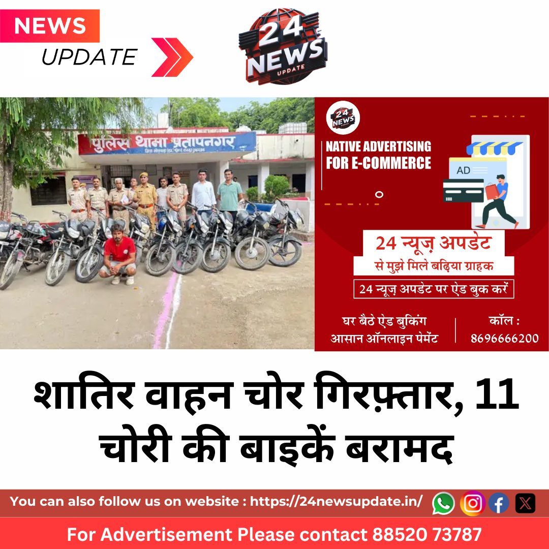 24 News Update भीलवाड़ा,। शहर में बढ़ती वाहन चोरी की घटनाओं के बीच प्रतापनगर थाना पुलिस ने बड़ी सफलता हासिल करते हुए एक शातिर बाइक चोर को पकड़ा है। पुलिस ने आरोपी की निशानदेही पर विभिन्न स्थानों से चोरी की गई 11 मोटरसाइकिलें बरामद की हैं, जबकि उसका एक अन्य साथी फरार है जिसकी तलाश जारी है।