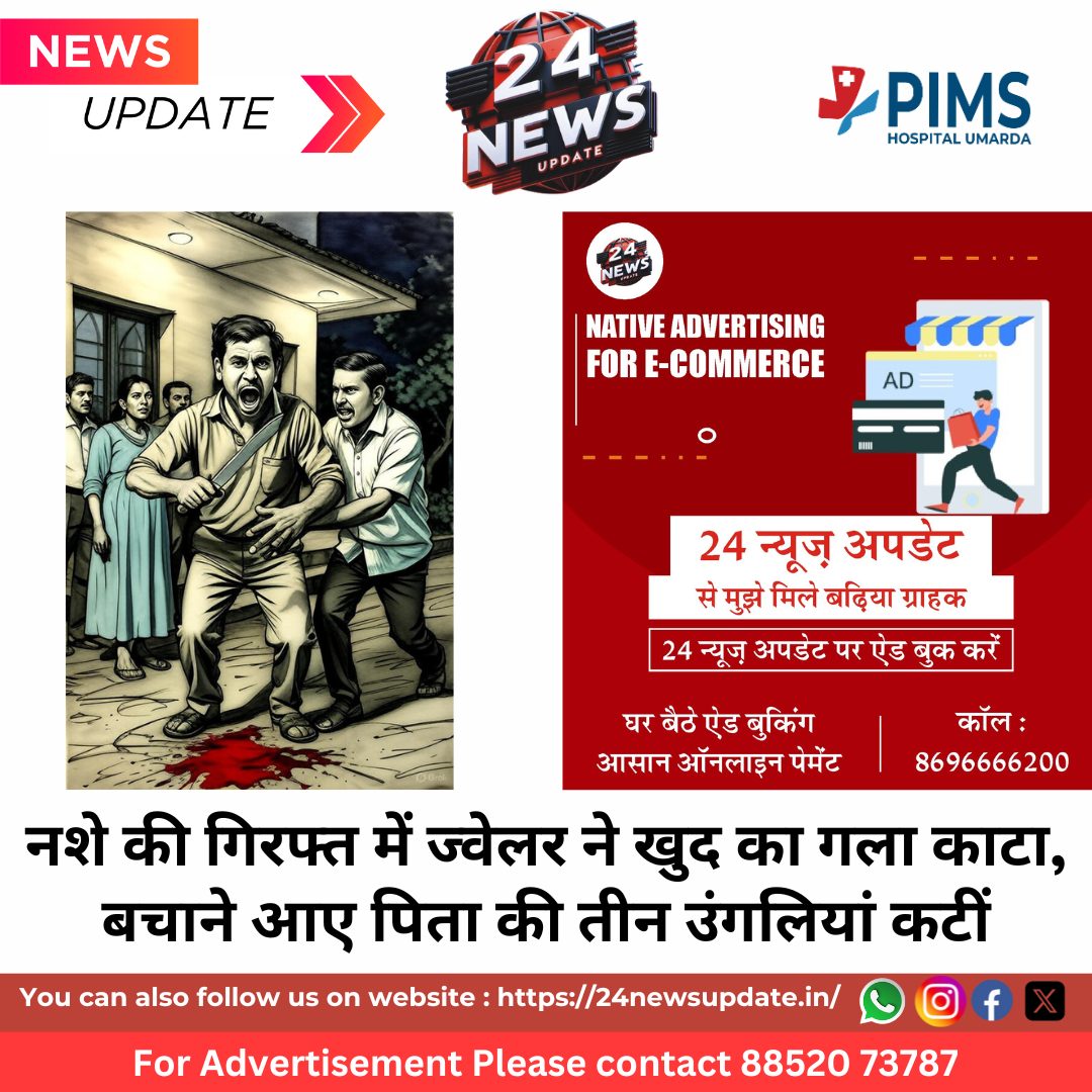 24 न्यूज अपडेट, जोधपुर। जोधपुर के शांत रातानाडा इलाके में शुक्रवार देर रात एक भयावह घटना ने सभी को दहला दिया। स्थानीय ज्वेलर ओमप्रकाश सोनी (45) ने नशे की हालत में चाकू से खुद का गला काटकर आत्महत्या कर ली। बेटे की चीख सुनकर जब पिता सत्यनारायण सोनी (65) बचाने दौड़े, तो उनका भी हाथ गंभीर रूप से घायल हो गया कृ तीन उंगलियां कट गईं।