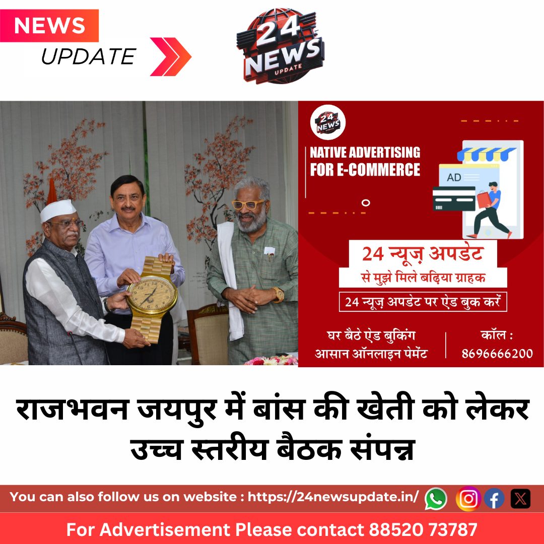 24 News Update उदयपुर. राज्य में बांस की खेती को बढ़ावा देने, वायुमंडलीय कार्बन अवशोषण में इसकी भूमिका, पर्यावरणीय लाभों तथा किसानों की आय बढ़ाने की संभावनाओं पर चर्चा हेतु एक उच्च स्तरीय बैठक का आयोजन राजभवन, जयपुर में माननीय राज्यपाल श्री हरिभाऊ किशनराव बगड़े की अध्यक्षता में किया गया। इस अवसर पर माननीय कुलाधिपति के सचिव डॉ. पृथ्वी राज जी, कृषि, उद्यानिकी एवं वन विभागों के सचिव स्तर के वरिष्ठ अधिकारीगण, एवं महाराणा प्रताप कृषि एवं प्रौद्योगिकी विश्वविद्यालय, उदयपुर के कुलपति डॉ. अजीत कुमार कर्नाटक सहित अनेक विशिष्टजन उपस्थित रहे।