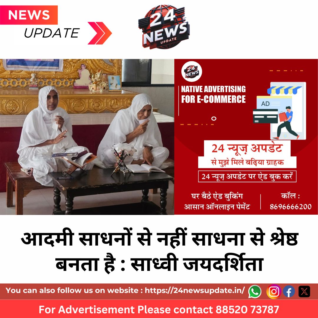 आयड़ तीर्थ के आत्म वल्लभ सभागार में बुधवार को आयोजित धर्मसभा में साध्वी जयदर्शिता श्रीजी ने प्रवचन में बताया कि आदमी साधनों से नहीं साधना से श्रेष्ठ बनता है। भवना से नहीं भावना से श्रेष्ठ बनता है। उच्चारण से नहीं उच्च आचरण से श्रेष्ठ बनता है। तीर्थंकर ने पांच कल्याण किए इसलिए पूज्य है। जिनके कल्याणक होते वह तीर्थंकर होते है साधारण मनुष्यों के कल्याण नहीं होते है। हमे भी भावना भानी है कि मैं भी तीर्थंकर बन जाऊ एवं मोक्ष को प्राप्त करु। संघर्ष करना है मोक्ष मोर्ग पर करना, मनुष्य की चाल धन से भी बदलती है और धर्म से भी बदलती है अगर मनुष्य के पास धर्म नहीं है तो कुछ भी नही है। प्रवचन में करीब 250 से अधिक श्रावक-श्राविकाएं प्रतिदिन धर्म लाभ ले रहे है।