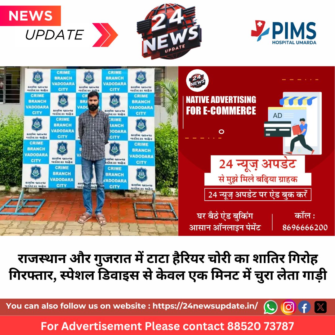 24 News Update नई दिल्ली। राजस्थान और गुजरात समेत कई राज्यों में टाटा हैरियर कारों की सिरफिरे तरीके से चोरी करने वाला गिरोह वड़ोदरा क्राइम ब्रांच की टीम ने गिरफ्तार किया है। गिरोह के दो मुख्य सदस्य रतन सिंह और दिलीप सिंह हैं। आरोपियों के पास से चोरी में इस्तेमाल होने वाले स्पेशल इलेक्ट्रॉनिक डिवाइस, सेंसर चाबी, मास्टर की, वायर कटर और फास्ट टैग कार्ड बरामद किए गए हैं।