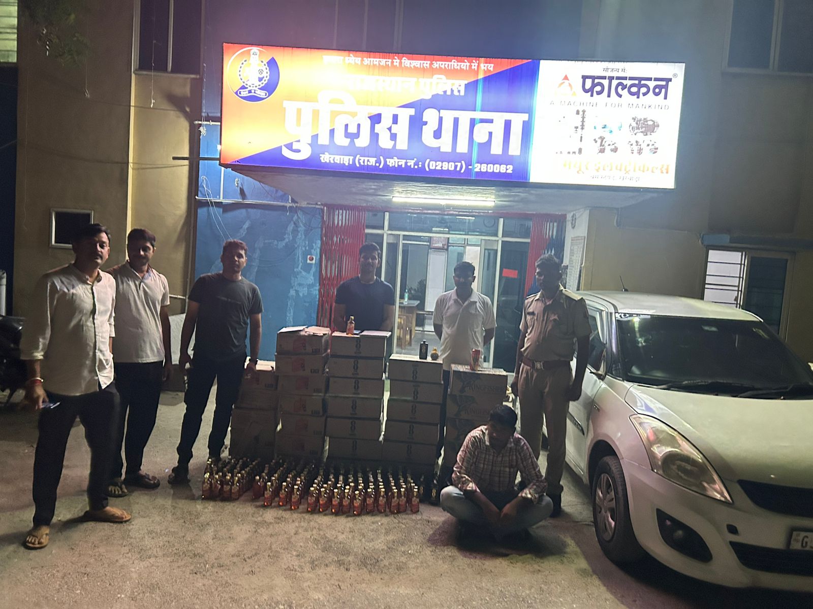पुलिस टीम द्वारा नाकाबंन्दी के दौरान मुखबिर की सुचना अनुसार पुलिस टीम द्वारा एक कार चालक ने नाकाबंन्दी को तोडकर खेरवाडा की तरफ तेज गति से वाहन लेकर भागा जिस पर पुलिस टीम द्वारा पीछा कर खेरवाडा बस स्टेण्ड के सामने उक्त कार को रोका एवं कार मे बैठे व्यक्ति ने अपना नाम जसवंत सिंह पिता प्रताप सिंह सिसोदिया उम्र 25 साल निवासी अदवास रोडावत थाना जावर माईन्स जिल सलुम्बर बताया। उक्त कार को चैक किया गया तो कार मे अवैध अंग्रेजी शराब होना पाया गया । पुलिस टीम द्वारा उक्त कार मे भरी शराब की गिनती करने पर विभिन्न वेराईटी की अंग्रेजी शराब के कुल 35 कार्टन भरे पाये गये। उक्त अग्रेजी शराब चालक जसवंत सिंह द्वारा बिना अनुज्ञापत्र एवं लाईसेंस के अपने कब्जे में रख परिवहन करना पाया जाने से अभियुक्त को गिरफ्तार किया गया। उक्त शराब का बाजार मुल्य करीब 04 लाख रूपये एवं वाहन की किमत करीब 8 लाख रूपये है। इस प्रकार थाना पुलिस द्वारा कुल 12 लाख का माल जब्त किया गया। पुलिस टीम द्वारा गहनता से अनुसंधान किया जा रहा है। पुलिस टीम में दलपत सिंह राठौड पु0नि0 थानाधिकारी खेरवाडा, राकेश मेहता सउनि,कास्टेबल भवंर सिंह, भरत नागदा (तीनों का विशेष योगदान) तथा कांस्टेबल हर्षित, सुरेश,कमल शामिल रहे।