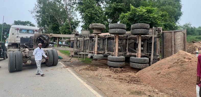 औद्योगिक क्षेत्र आडीवाट मार्ग पर आज सुबह एक बडा ट्रोल अपनी बजरी को खाली करने के लिए सडक किनारे खडा था। तभी ट्रक का पिछला पहिया अचानक मिटटी में धंसने के कारण पलट गया। जिससे बजरी पूरी सडक के किनारे फैल गई। वही अचानक हुए इस हादसे के कारण लोगों में हडकंप मच गया। जोर की आवाज के कारण आसपास के लोग दौडकर वाहन के पास पहुंचें वाहन का पिछला हिस्सा चेचिंस से टूटकर अलग हो गया। इसके कारण चालक को किसी भी प्रकार का नुकसान नही हुआ। वही आने—जाने वाले राहगीर भी बच गए। लेकिन वाहन के टूट के गिरने से दोनो तरह लम्बा जाम लग गया। करीब दो घंटे तक वाहन के जाम में फंसे रहने के कारण लोगों को काफी परेशानी हुई। वाहन को क्रेन की सहायता से अलग करने के बाद जेसीबी से बजरी को सडक से दूर किया गया। इसके बावजूद वाहनों की आवाजाही शुरू हुई। सागवाडा और डूंगरपुर शहर में लगातार बजरी के वाहनों के अनियत्रित होकर पलटने से आवागमन बाधित हो रहा हैं। इसी प्रकार का हादसा मंगलवार को डूंगरपुर शहर से जुडे बिलडी क्षेत्र में हुआ था। जहां पर एक बजरी से भरा डंपर अनियत्रित होकर डिवाइडर पर चढ गया था।