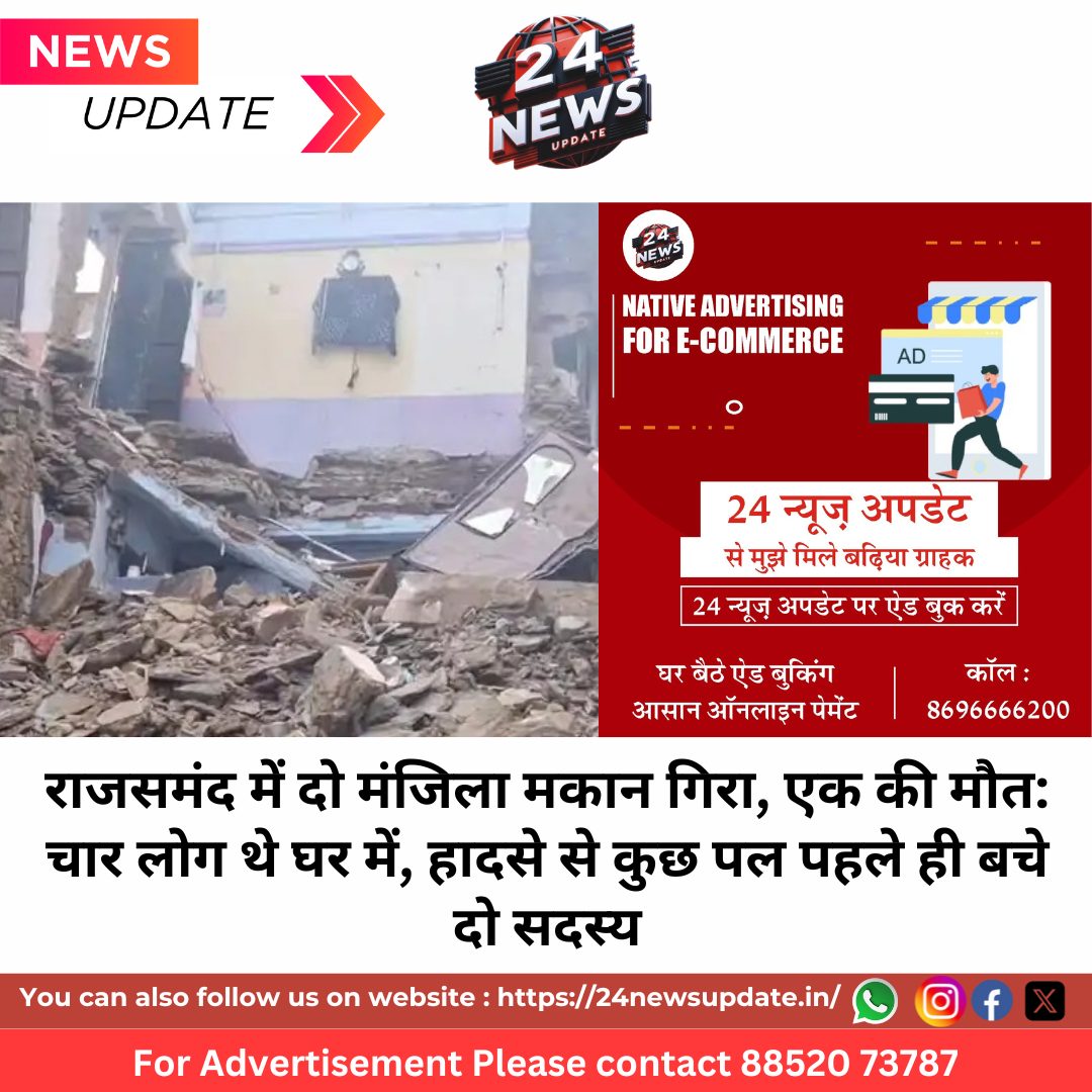 24 News Update राजसमंद | जिले के कांकरोली क्षेत्र के धोरा मोहल्ला में सोमवार देर रात एक जर्जर दो मंजिला मकान भरभराकर गिर गया, जिससे मलबे में दबकर एक व्यक्ति की मौत हो गई, जबकि एक महिला गंभीर रूप से घायल हो गई। हादसे के वक्त मकान में एक ही परिवार के चार सदस्य सो रहे थे, जिनमें से दो सदस्य अंतिम क्षणों में बाल-बाल बच गए।
