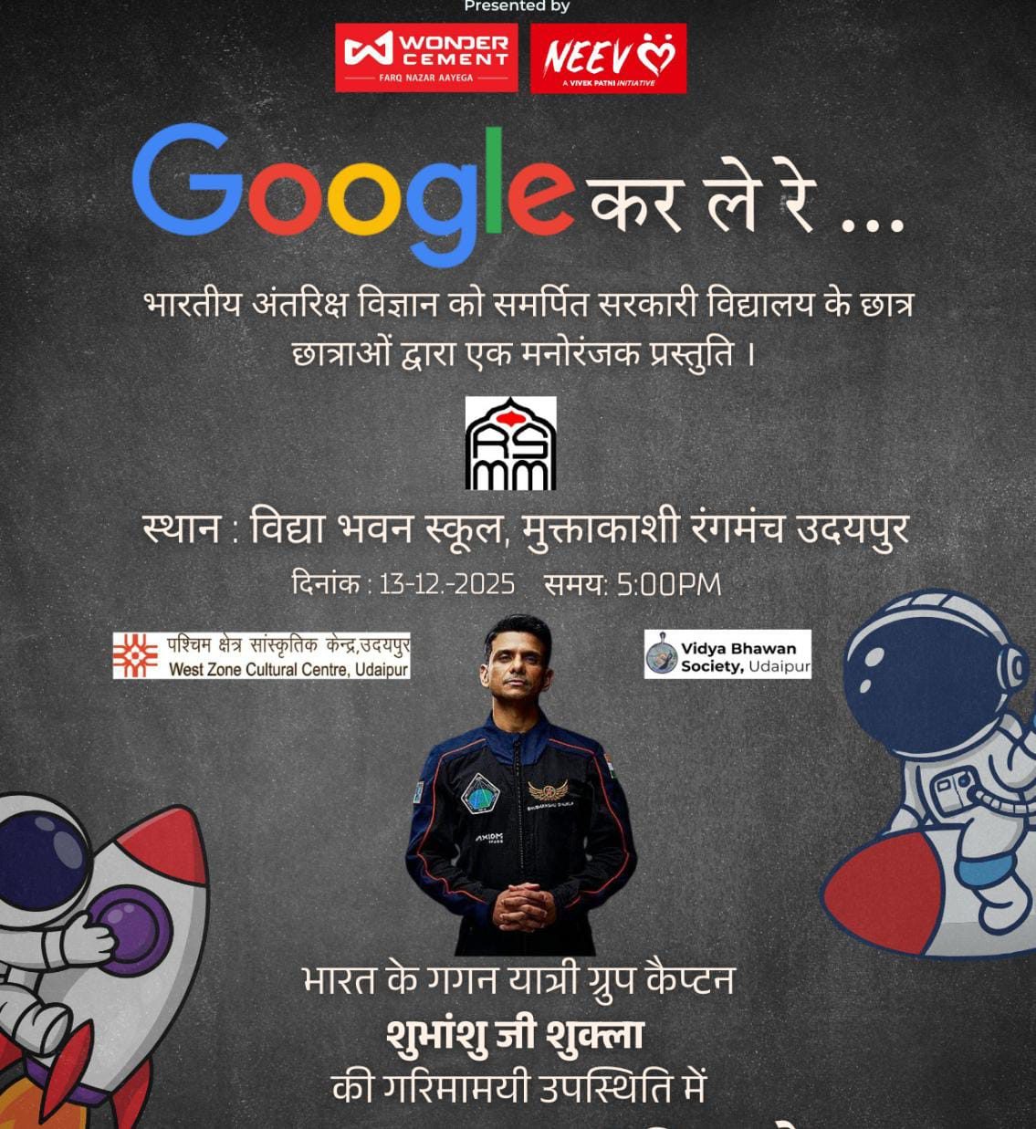 यह कार्यक्रम शहर के कला जगत में सक्रिय संस्था क्रिएटिव सर्किल द्वारा सजेगा, जिसमें आरएसएमएम, वंडर सीमेंट, नींव, पश्चिम क्षेत्र सांस्कृतिक केंद्र उदयपुर और विद्याभवन सोसायटी का सहयोग मिला है। कार्यक्रम संयोजक, स्केच आर्टिस्ट एवं प्रदेश के ख्यात आर्किटेक्ट सुनील एस. लड्ढा ने हाल ही में ग्रुप कैप्टन शुक्ला से मुलाकात कर उन्हें इस विशेष आयोजन में शामिल होने का अनुरोध किया था।