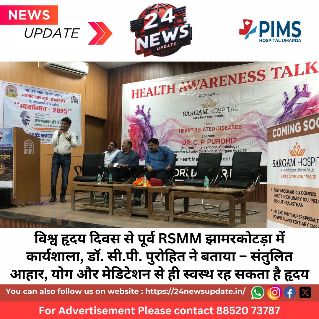 24 News Update उदयपुर। राजस्थान स्टेट माइन्स एंड मिनरल्स लिमिटेड (RSMM), झामरकोटड़ा में रविवार को सरगम हॉस्पिटल, उदयपुर के संयुक्त तत्वावधान में विश्व हृदय दिवस (29 सितम्बर) के पूर्व अवसर पर एक दिवसीय कार्यशाला का आयोजन किया गया। इस कार्यक्रम में वरिष्ठ हृदय रोग विशेषज्ञ (कार्डियोलॉजिस्ट) डॉ. सी.पी. पुरोहित मुख्य वक्ता के रूप में उपस्थित रहे।