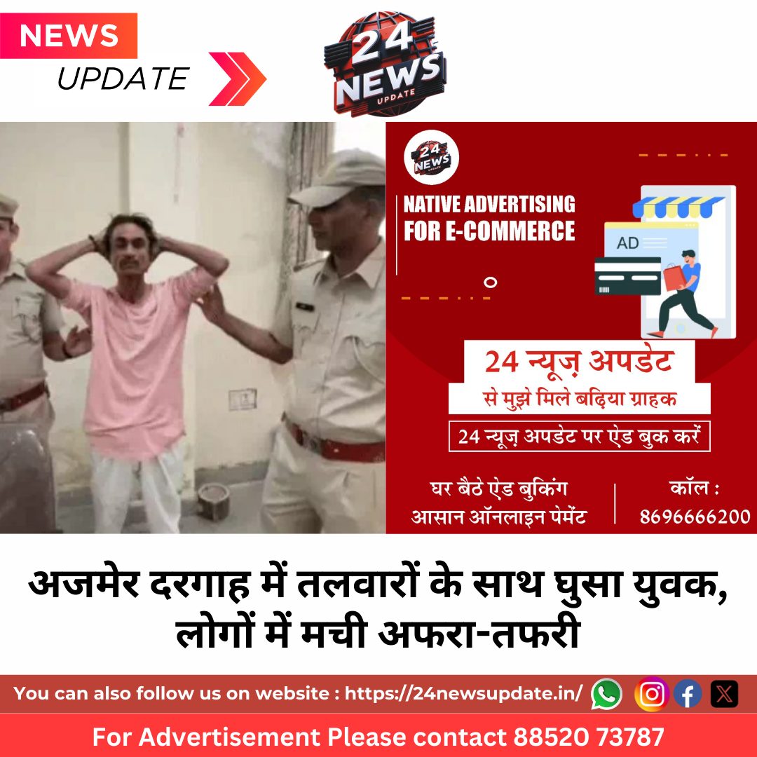 24newsupdate अजमेर। अजमेर की ख्वाजा गरीब नवाज दरगाह में मंगलवार सुबह उस समय हड़कंप मच गया जब एक अर्द्धनग्न युवक तीन तलवारें लेकर अंदर घुस आया। उसकी इस हरकत से वहां मौजूद श्रद्धालुओं में दहशत फैल गई, और लोग इधर-उधर भागने लगे।