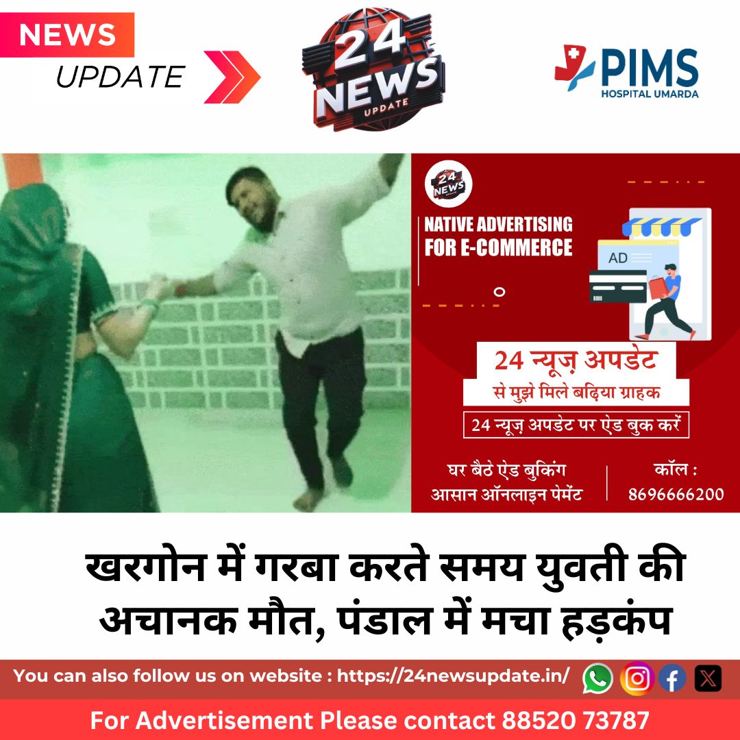 24 News Update मध्यप्रदेश। खरगोन जिले के भीकनगांव क्षेत्र के ग्राम पलासी में रविवार रात मां दुर्गा के पंडाल में गरबा कर रही एक युवती की अचानक हार्ट अटैक से मौत हो गई। मृतका सोनम (19) थी, जिसकी शादी इस वर्ष मई में कृष्णपाल से हुई थी। घटना की जानकारी सोमवार सुबह वीडियो के माध्यम से सामने आई।