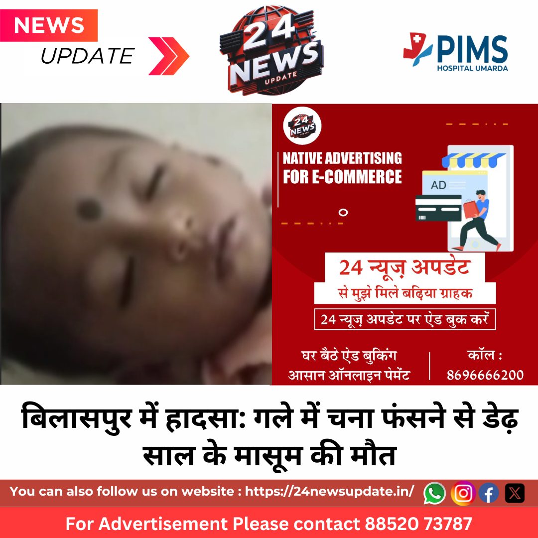 24 News Update छत्तीसगढ़. छत्तीसगढ़ के बिलासपुर जिले में मंगलवार को एक दर्दनाक हादसा हुआ। रतनपुर थाना क्षेत्र में डेढ़ साल के मासूम शिवांश पोर्ते की गले में चना फंसने से मौत हो गई। बच्चा घर में खेलते समय चना निगल गया था, जो उसकी सांस नली में अटक गया। इससे बच्चा छटपटाने लगा और उसकी तबीयत बिगड़ गई।