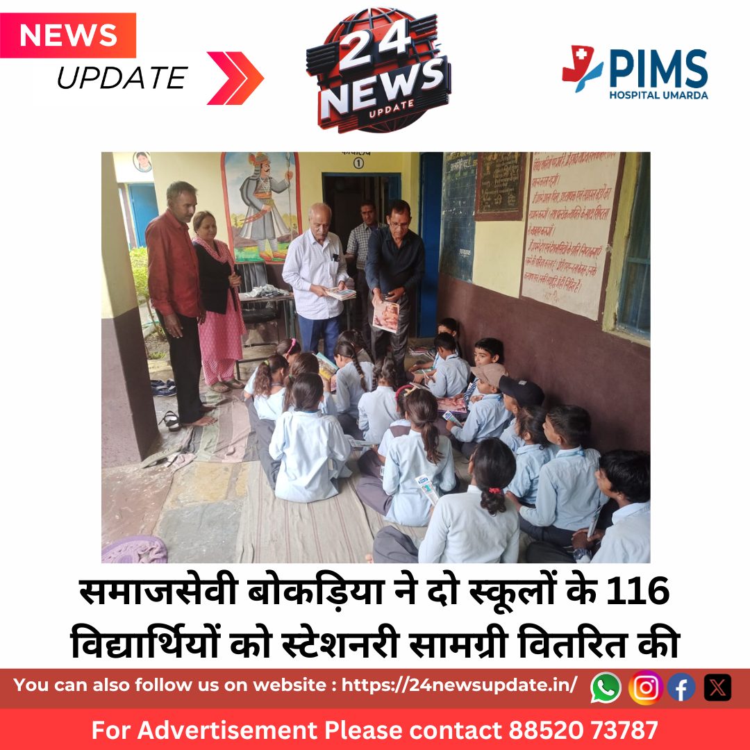 24 News Update उदयपुर। शिक्षा प्रोत्साहन और विद्यार्थियों की अध्ययन सामग्री की आवश्यकता को ध्यान में रखते हुए खेरोदा निवासी समाजसेवी मदनलाल बोकड़िया की ओर से जिले के दो विद्यालयों में विद्यार्थियों को स्टेशनरी सामग्री वितरित की गई। यह वितरण क्रमशः राजकीय उच्च माध्यमिक विद्यालय, बाठरड़ा खुर्द एवं नरदावतों का फला राजकीय प्राथमिक विद्यालय, पंचायत अड़िंदा में आयोजित हुआ। कार्यक्रम में कुल 116 विद्यार्थियों को कापियाँ, पेंसिल, शार्पनर और इरेज़र जैसी आवश्यक सामग्री प्रदान की गई।