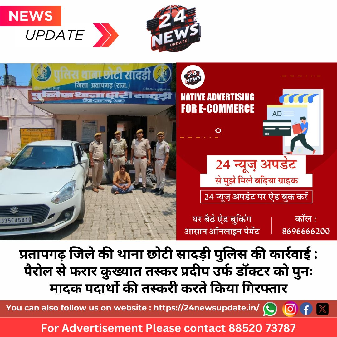 24 News Update जयपुर। प्रतापगढ़ जिले की थाना छोटी सादड़ी पुलिस ने मंगलवार को नाकाबंदी में एक स्विफ्ट कार से 81 किलो 440 ग्राम अफीम डोडा चूरा जब्त कर तस्कर प्रदीप पारीक उर्फ डॉक्टर पुत्र श्याम लाल पारीक (45) निवासी गाडरियावास थाना छोटीसादडी को गिरफ्तार किया है। पैरोल से फरार आरोपी तस्कर फिर से मादक पदार्थ तस्करी करते पकड़ा गया है। जब्त मादक पदार्थ की कीमत करीब 12 लाख रुपए आंकीं गई है।
