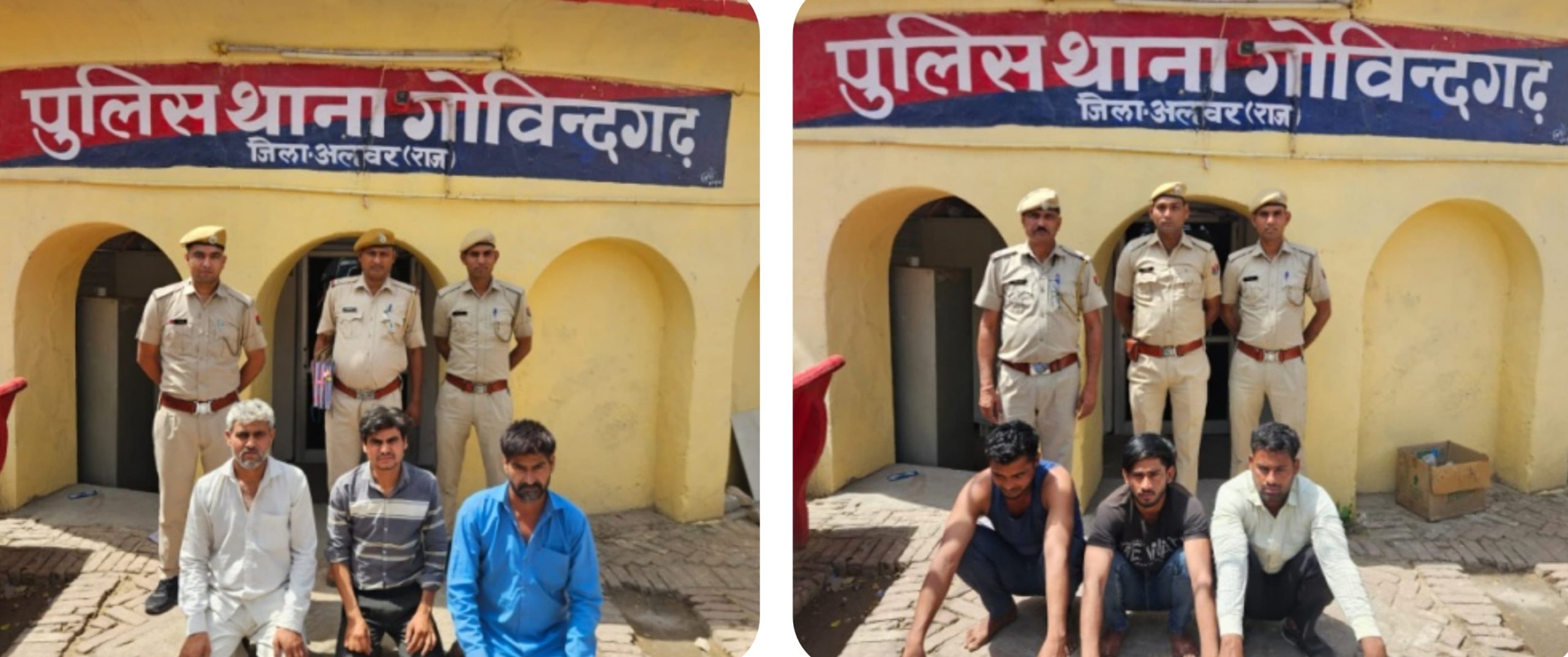 आरोपियों की गिरफ्तारी के लिए एसपी नैन द्वारा अतिरिक्त पुलिस अधीक्षक डॉ प्रियंका व सीओ कैलाश जिंदल के सुपरविजन एवं एसएचओ गोविंदगढ़ बने सिंह के नेतृत्व में टीम गठित की गई। गठित टीम द्वारा पहले मामले में आरोपीय कासमदिन उर्फ कासम पुत्र भूरे खां मेव (34), शहजाद पुत्र रहमत (45) एवं उस्मान मेव पुत्र भूरे खां (47) निवासी फाहरी को गिरफ्तार कर दो लाठी व एक डंडा एवं दूसरे मामले में आरोपी फकरुदीन पुत्र इसाक (32), साबिर पुत्र इलियास (22) एवं आसिफ उर्फ आसिन पुत्र अब्दुल्ला खान उर्फ अब्दुल (25) निवासी फाहरी थाना गोविंदगढ़ को गिरफ्तार कर एक अवैध 12 बोर बंदूक 11 जिंदा एवं पांच खाली कारतूस बरामद किए हैं।