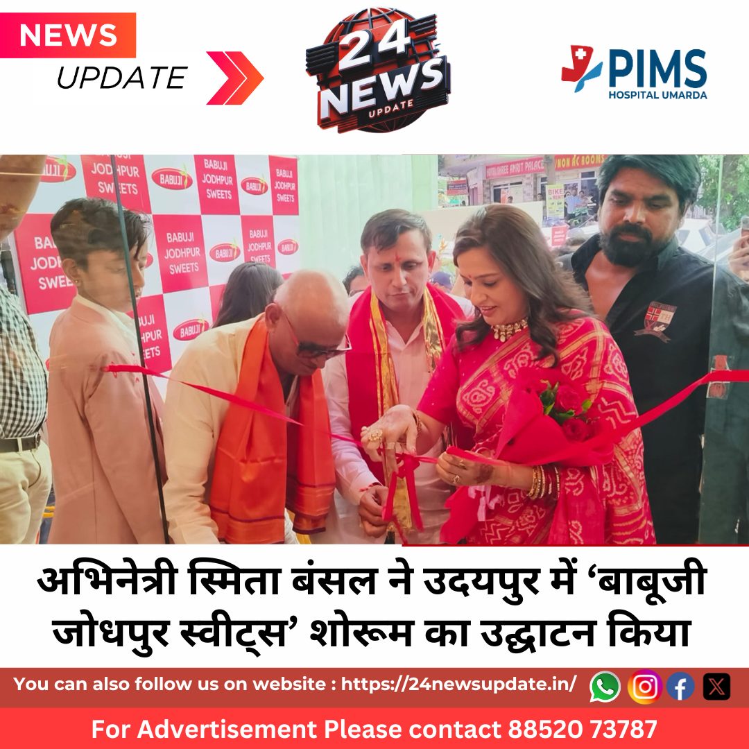 24 News Update. उदयपुर। प्रसिद्ध टीवी अभिनेत्री स्मिता बंसल, जिन्हें धारावाहिक ‘बालिका वधू’ में उनके सशक्त अभिनय के लिए जाना जाता है, सोमवार को झीलों की नगरी उदयपुर पहुंचीं। उन्होंने सूरजपोल स्थित ‘बाबूजी जोधपुर स्वीट्स’ के नए शोरूम का फीता काटकर एवं दीप प्रज्वलन कर उद्घाटन किया। मिठाइयों का स्वाद चखते हुए स्मिता ने कहा, “उदयपुर की मिठास और लोगों का अपनापन हमेशा दिल को छू जाता है।”