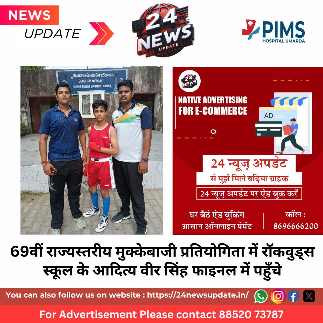 24 News Update उदयपुर। अजमेर के तोप दड़ा स्कूल में आयोजित 69वीं राज्यस्तरीय मुक्केबाजी प्रतियोगिता में रॉकवुड्स स्कूल, उदयपुर के छात्र आदित्य वीर सिंह ने अपने शानदार प्रदर्शन से फाइनल में प्रवेश कर लिया है।